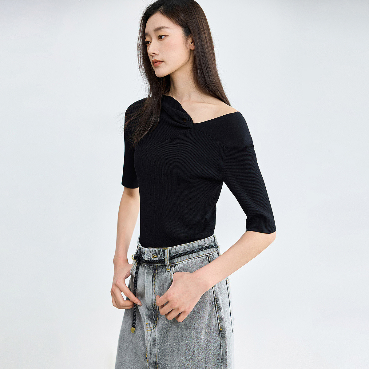 【春季】设计感扭结露肩时尚气质黑色修身针织衫 093979