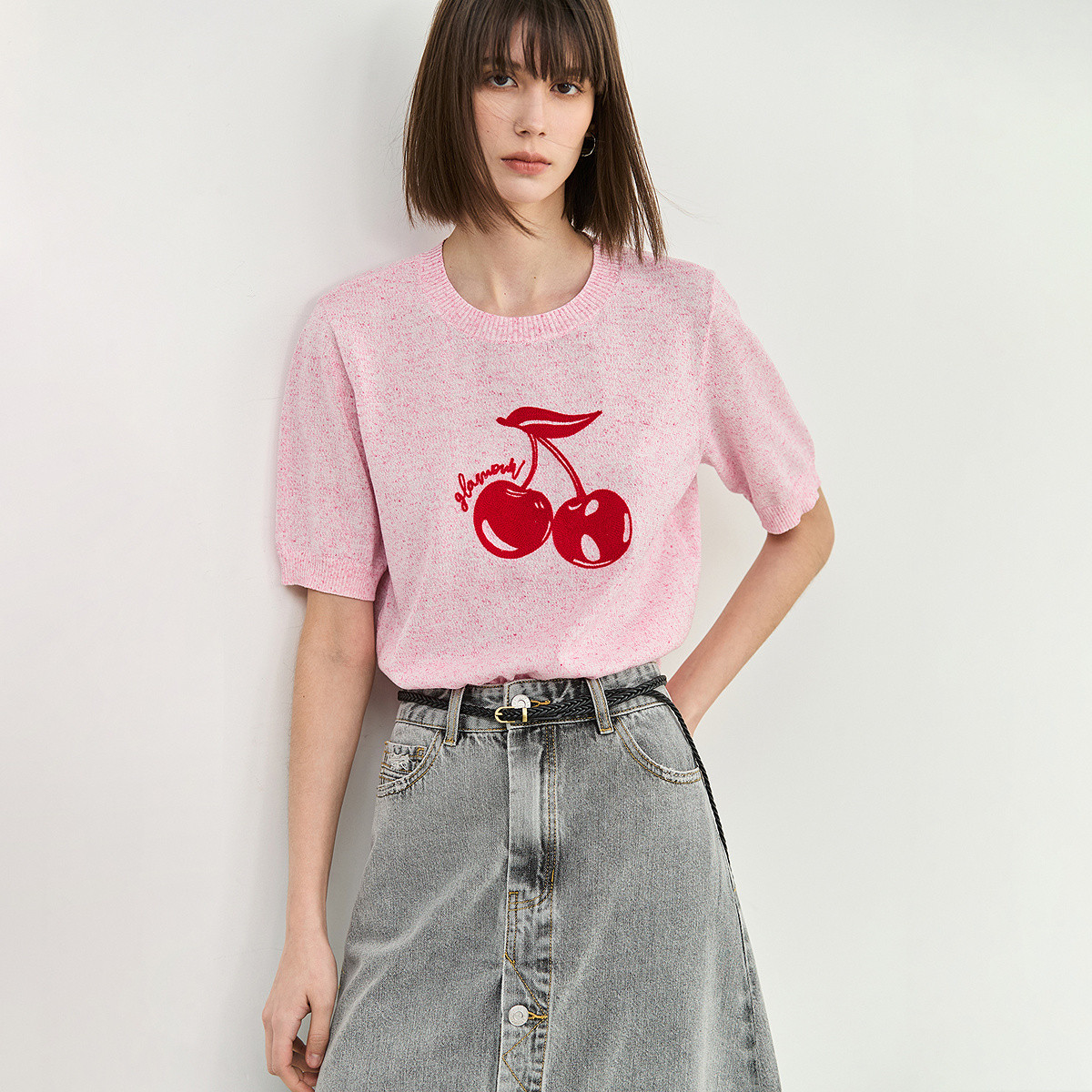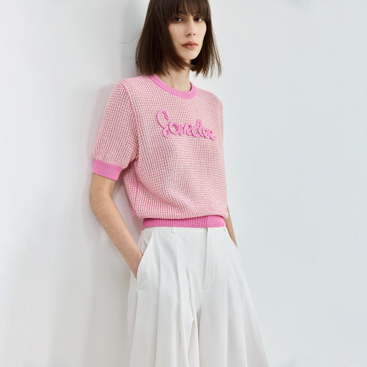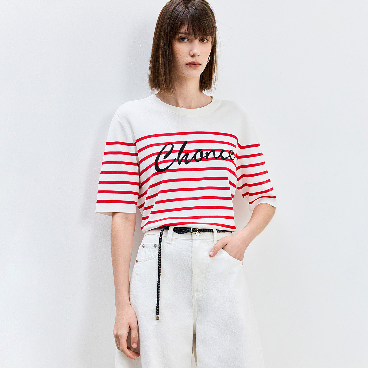 【春季】时尚条纹前片艺术花卉字体绣花短袖针织衫 723675