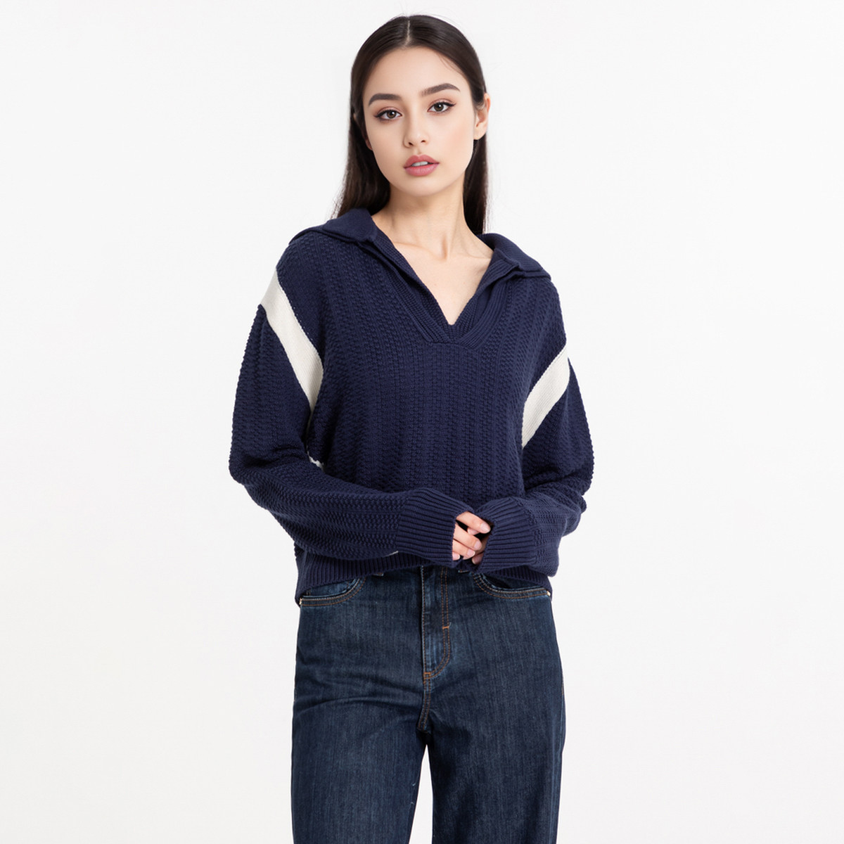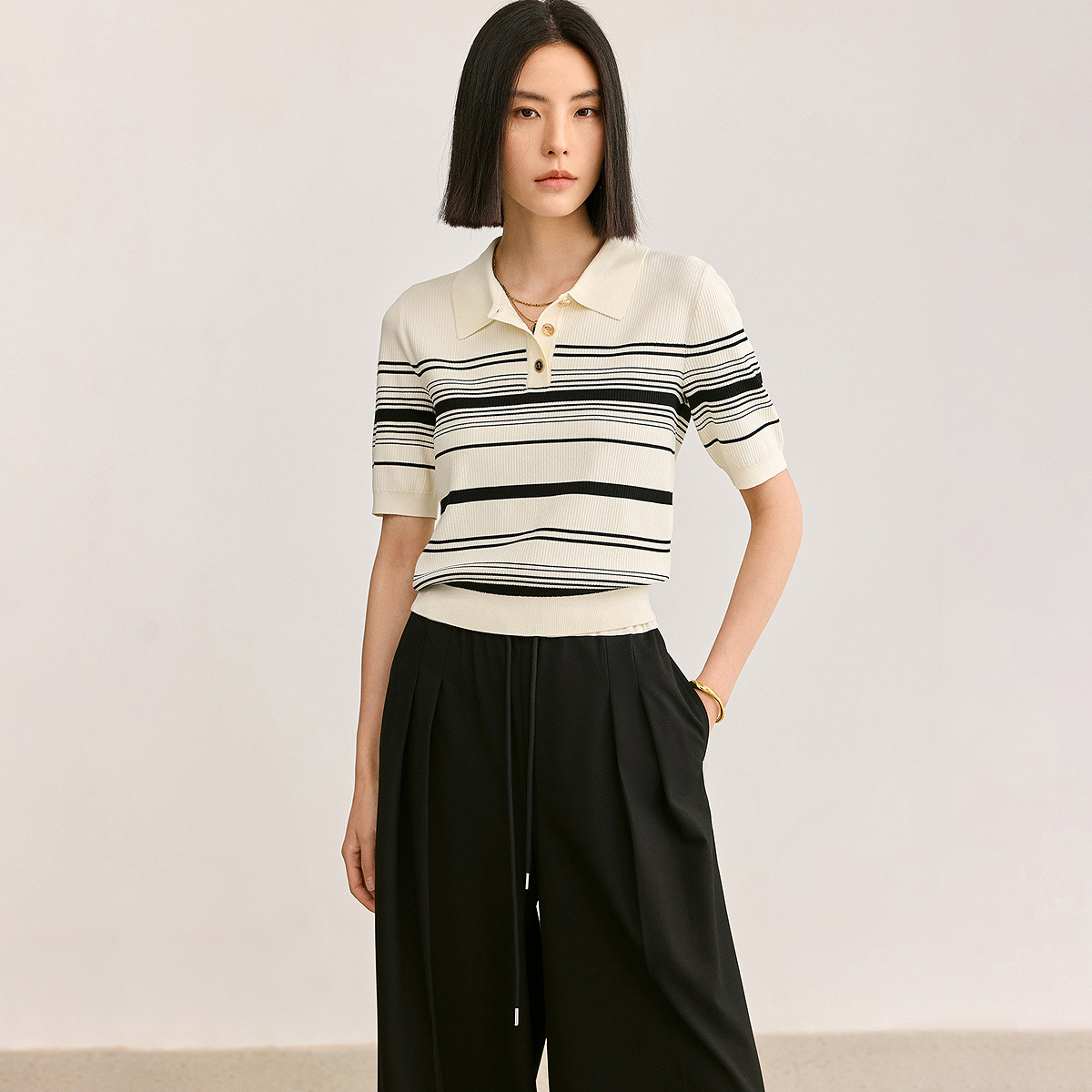 春秋款纯绵羊毛条纹小翻领拼色设计感修身套头针织衫朗姿集团 001497