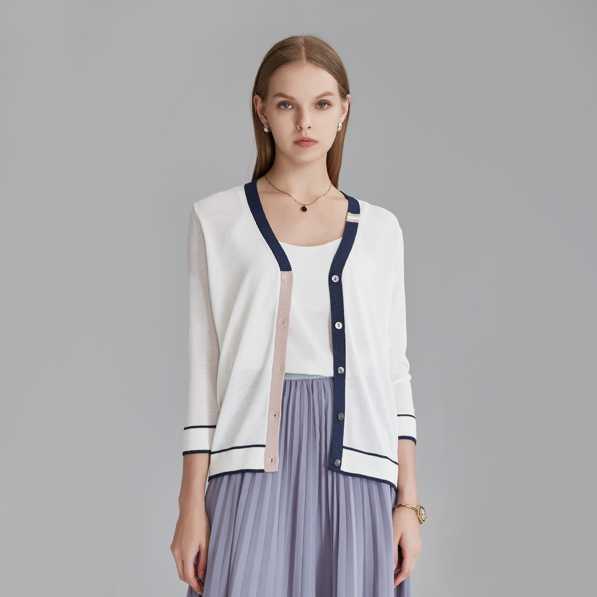 【含天丝桑蚕丝】春夏专柜修身v领拼色针织开衫气质百搭时尚 618897