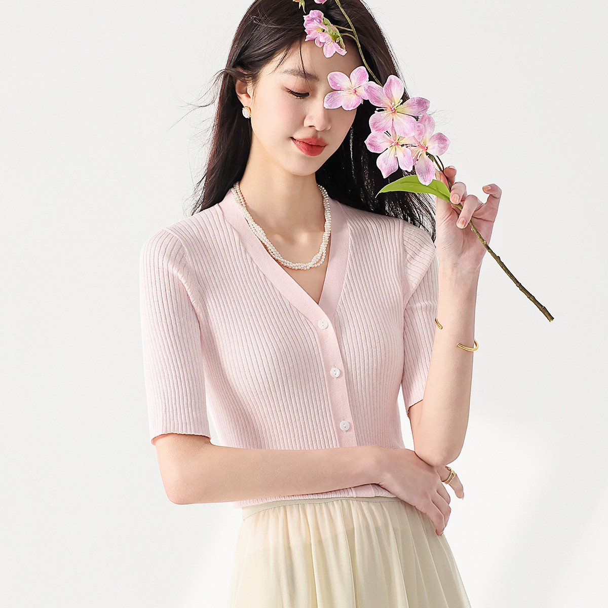 夏款透气纯色坑条V领短袖桑蚕丝针织杉女开衫修身T恤外套空调衫 206739