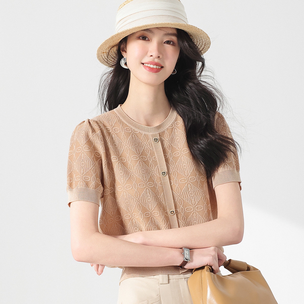 夏款轻薄纯色提花含桑蚕丝针织衫女开衫打底假开衫短袖T恤 079059