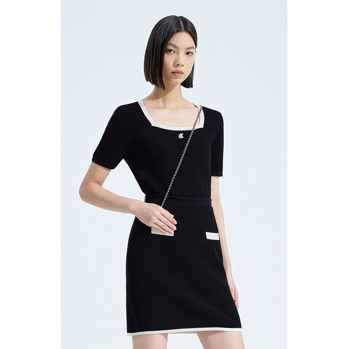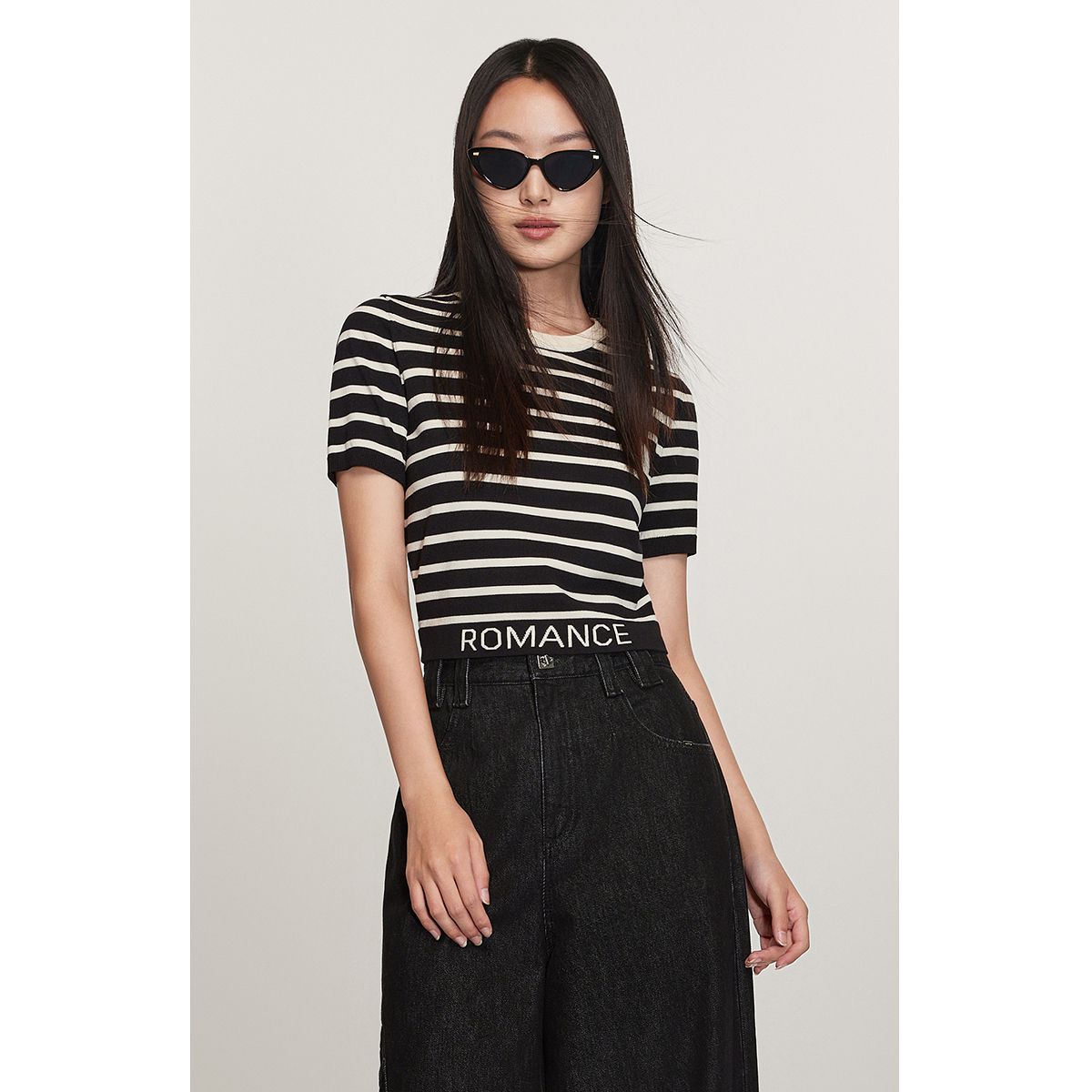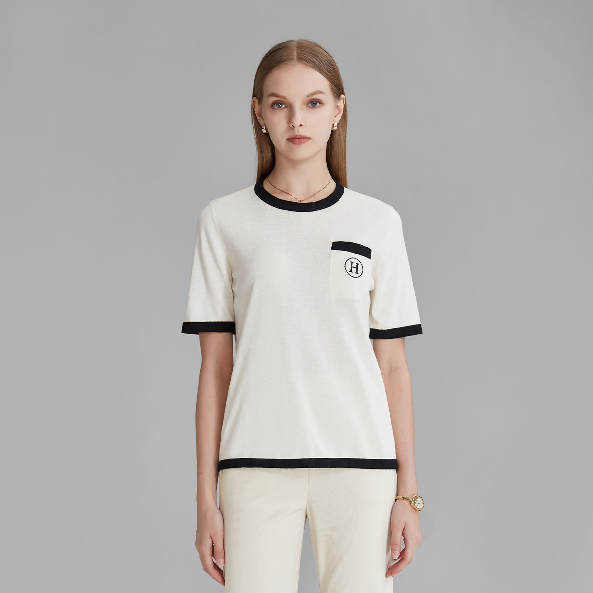 春夏新款撞色圆领针织T恤女简约时尚设计感日常休闲百搭短袖上衣 880543