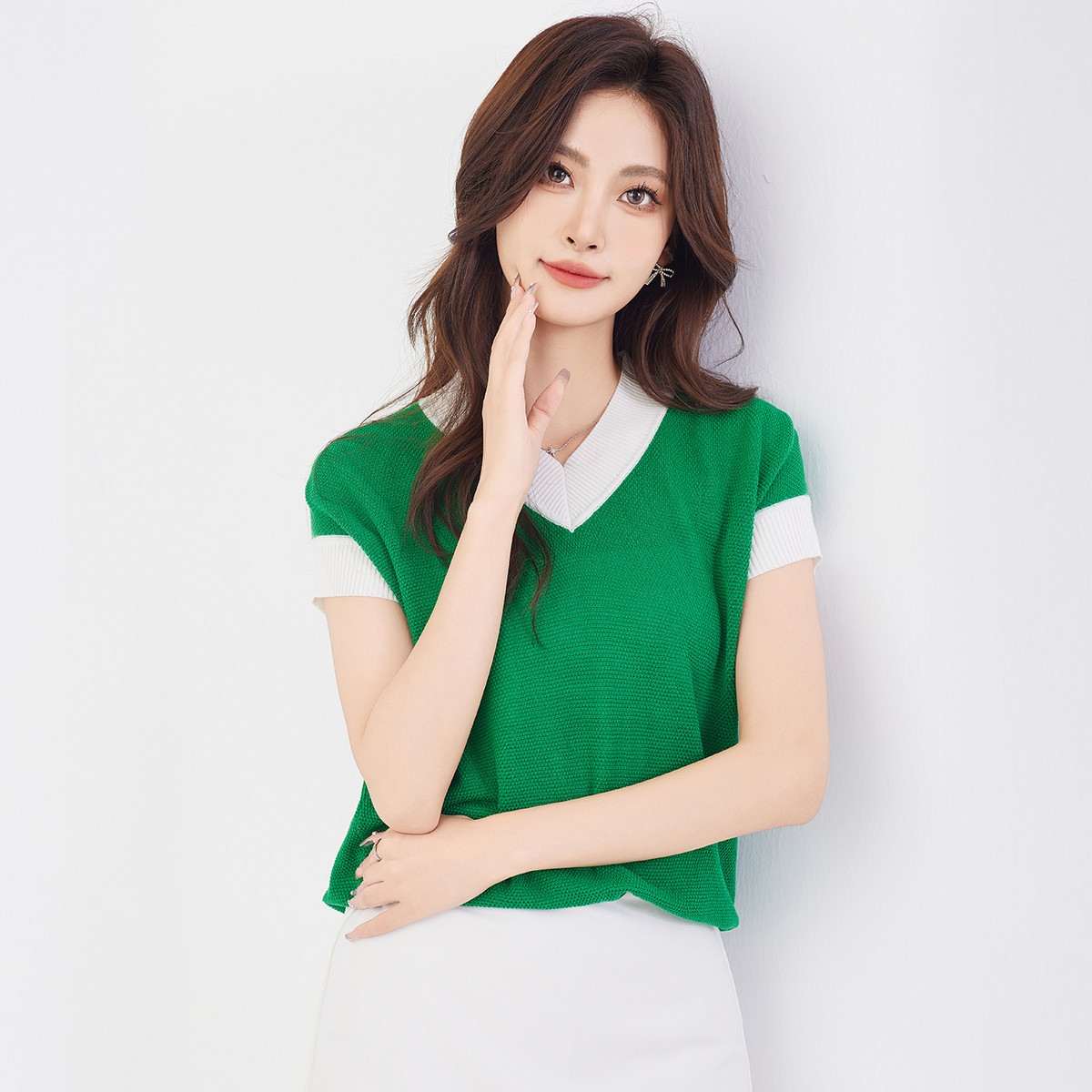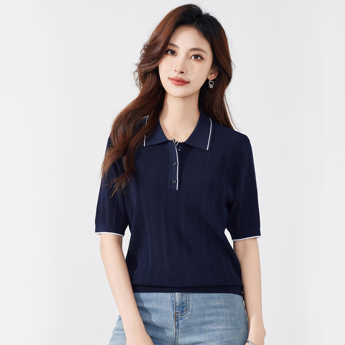 【简约高级感】气质撞色翻领短袖针织衫休闲百搭商务通勤短款上衣 853471