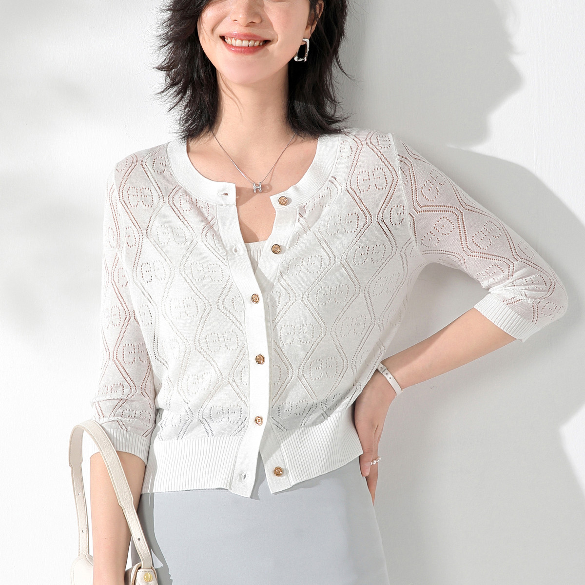 【含桑蚕丝 性感镂空】时尚纯色七分袖中袖透气亲肤夏款针织开衫 888275