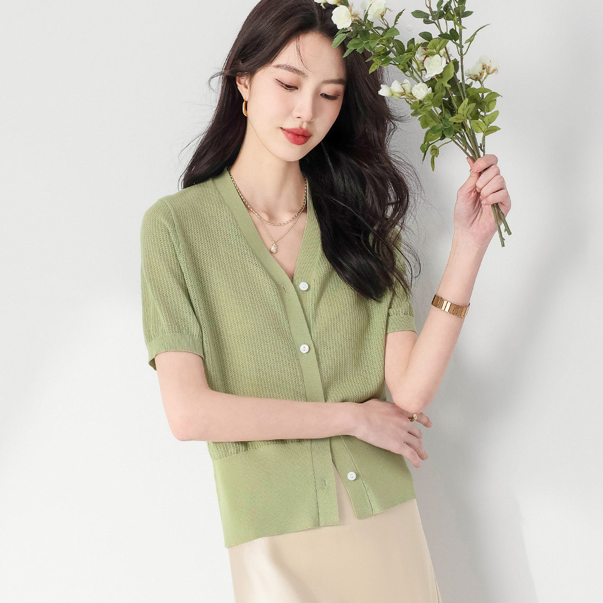 【含桑蚕丝】轻薄透气简约纯色V领针织杉女夏短袖开衫空调衫外套 070611