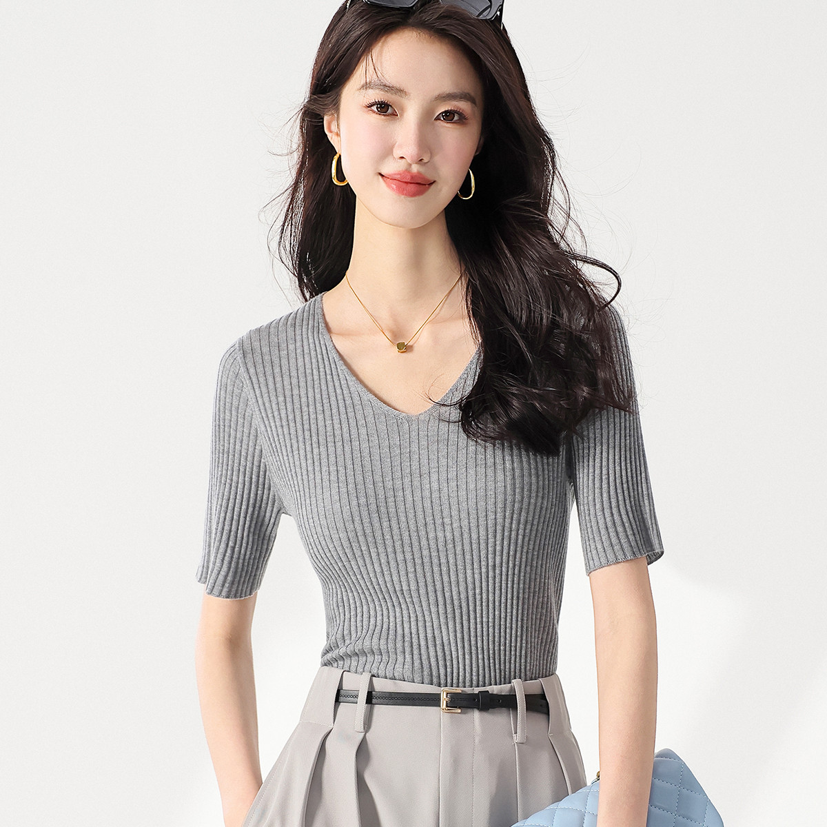 【含羊毛】纯色基础百搭坑条V领针织打底衫女 225107