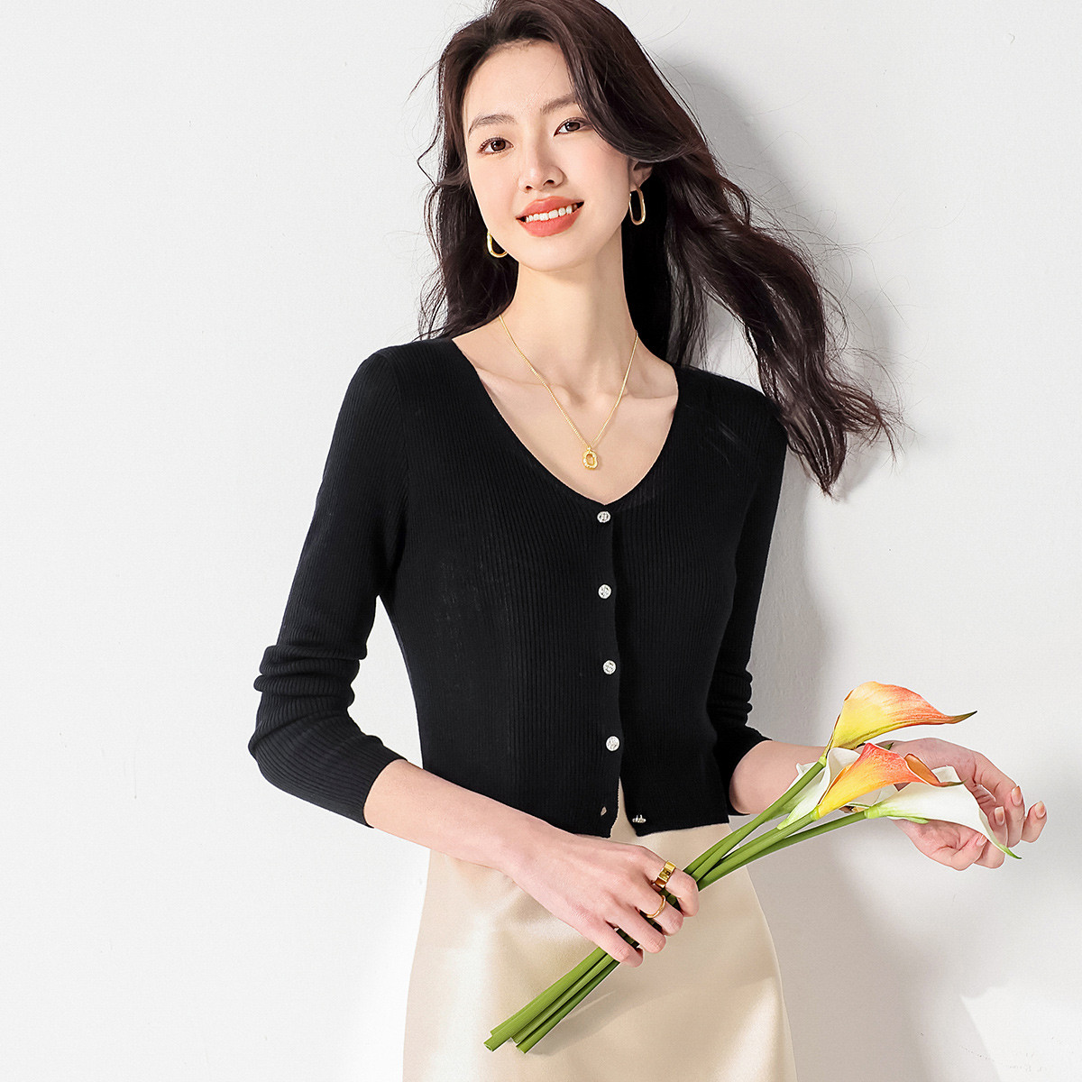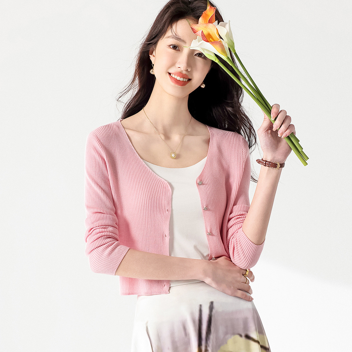 【含桑蚕丝】纯色V领抽条长袖针织打底开衫外套夏款空调衫小衫 938259