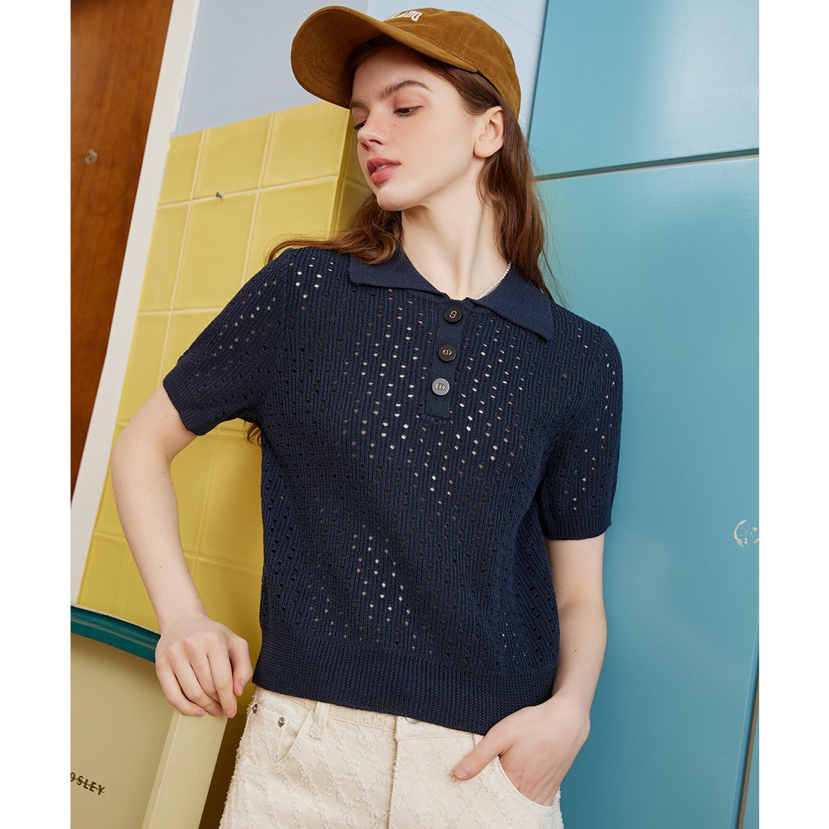 简约撞色Polo领镂空设计女式针织衫夏季收腰短袖上衣 167325