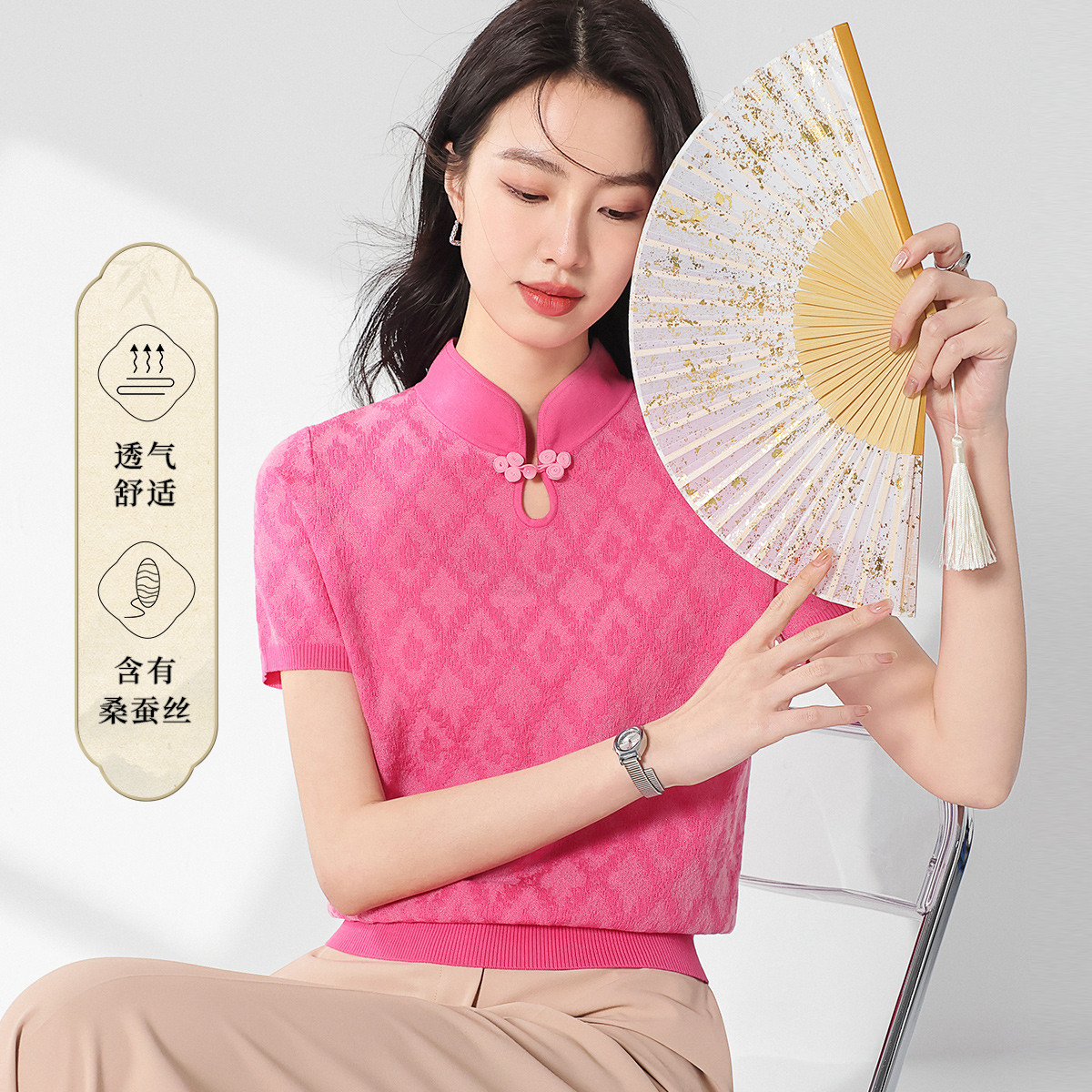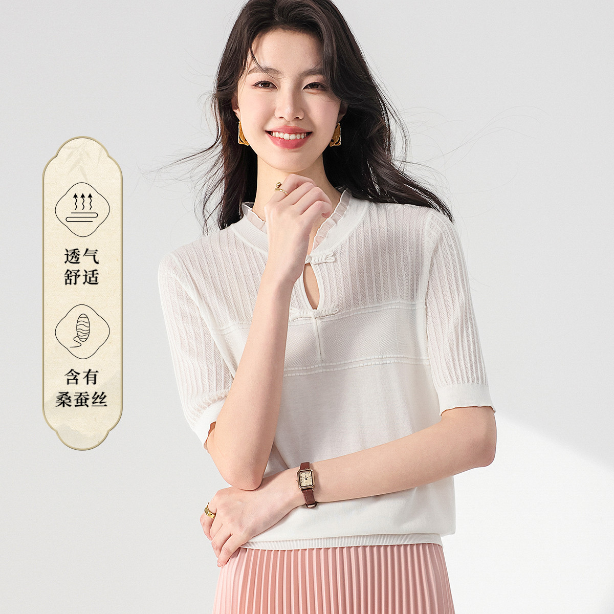 【国风】新中式盘扣含桑蚕丝针织衫女夏短袖T恤淑女衬衣上衣 271571