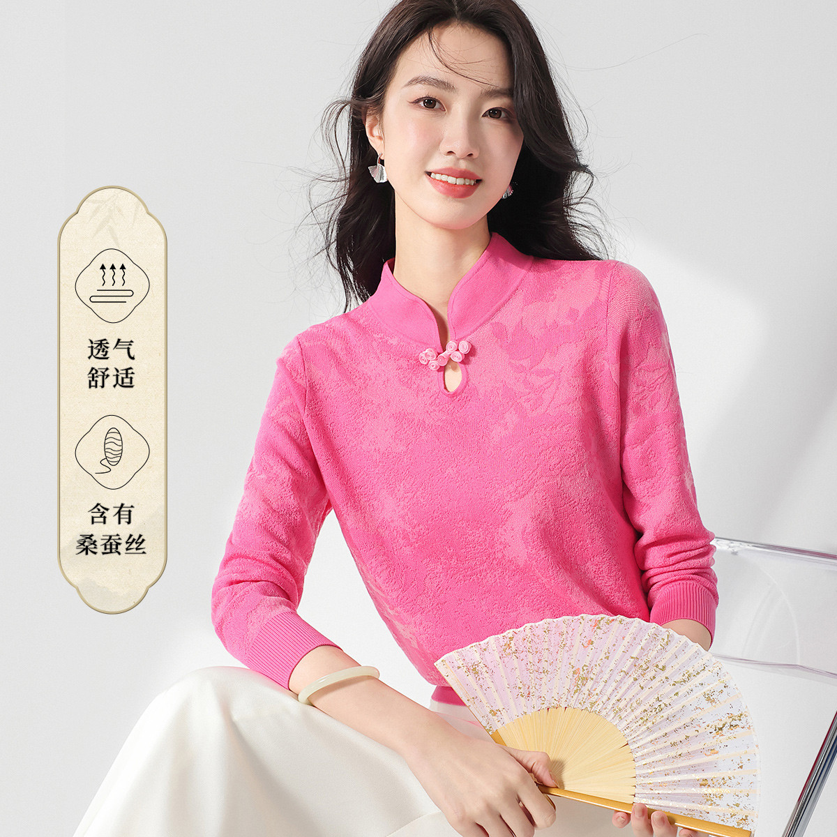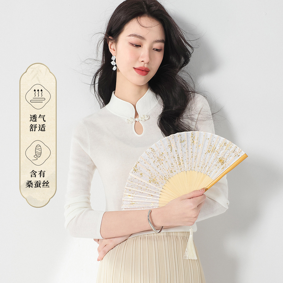 【国风】新中式轻薄透气含桑蚕丝立领针织打底衫夏款长袖T恤 407955