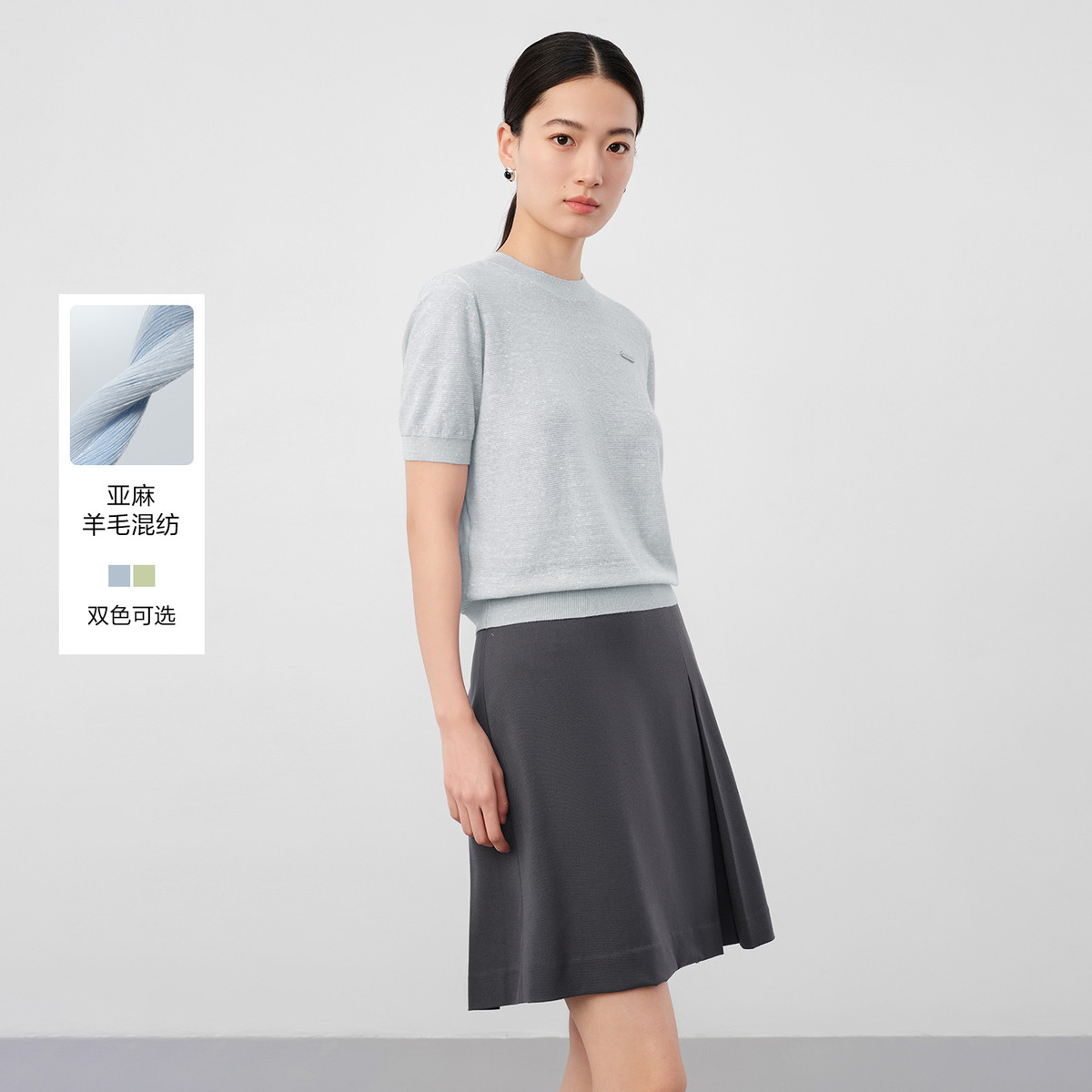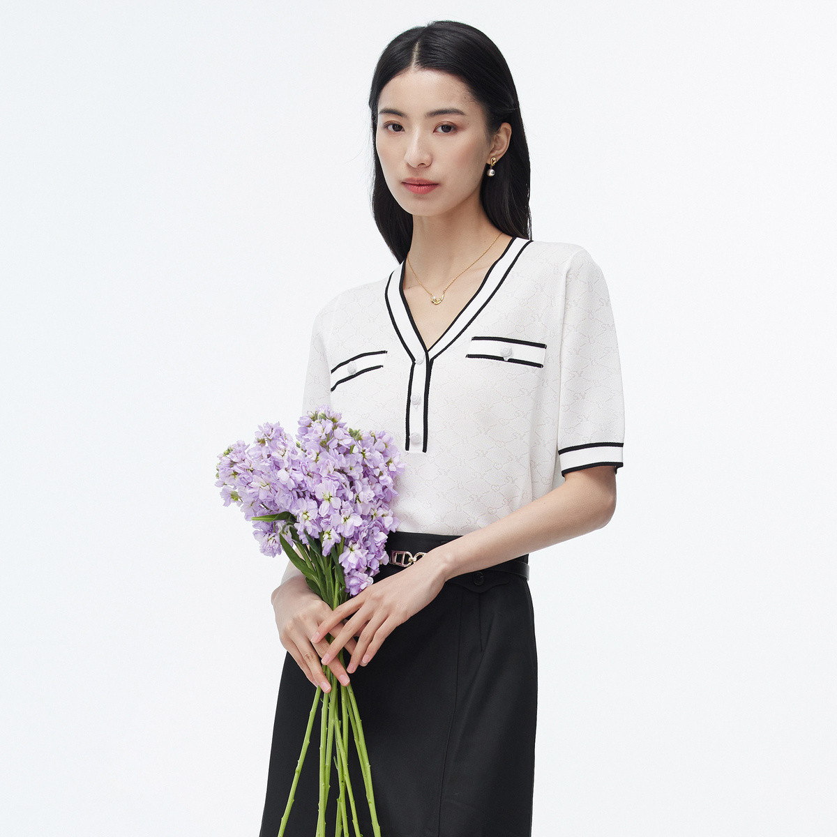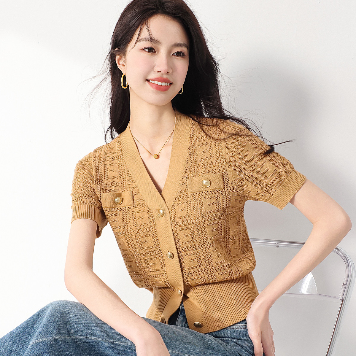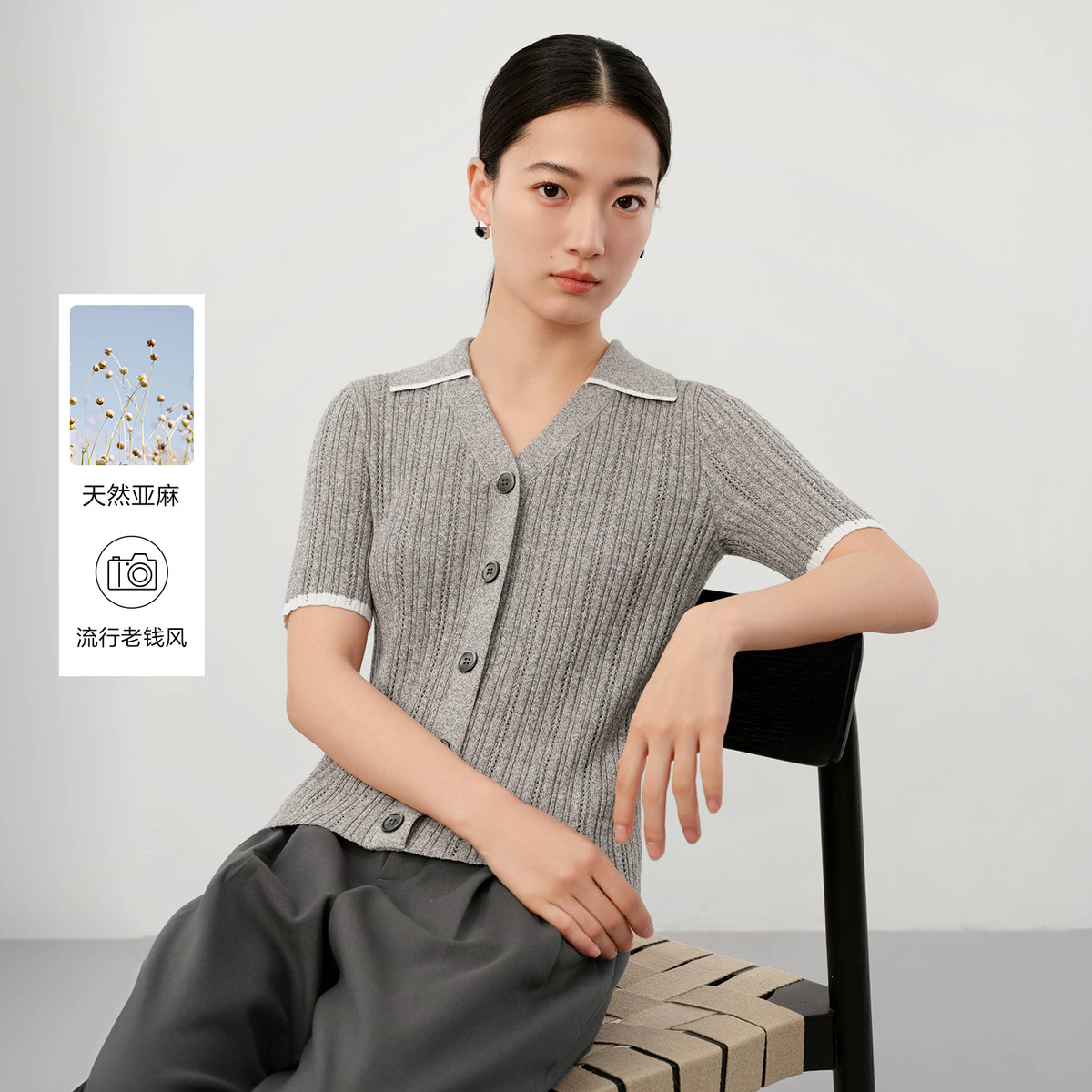 旗下安娜蔻系列通勤风clean fit亚麻镂空翻领撞色针织衫夏季 977932