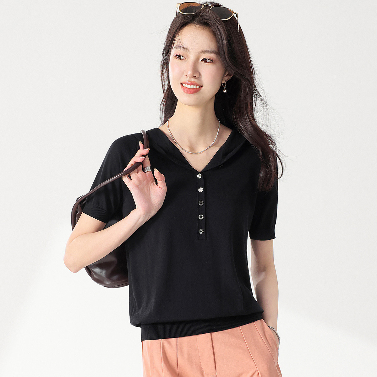 【含桑蚕丝】简约百搭纯色连帽短袖卫衣针织衫打底衫T恤女夏 334099