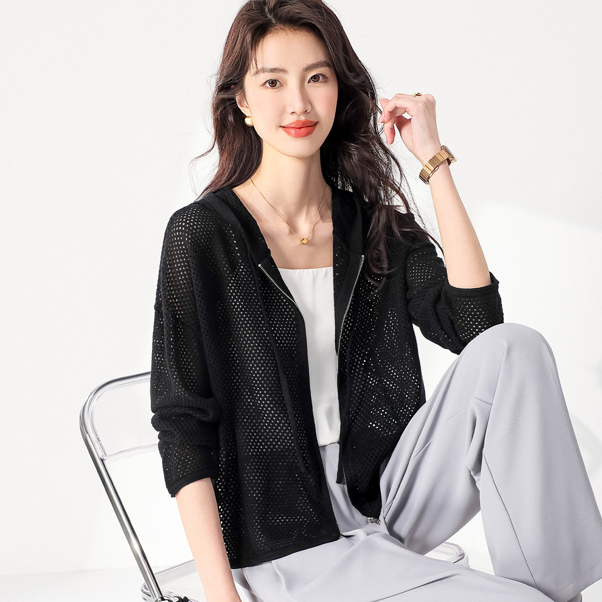 轻薄透气网眼镂空连帽羊毛针织开衫毛衣外套夏款空调衫卫衣 714387