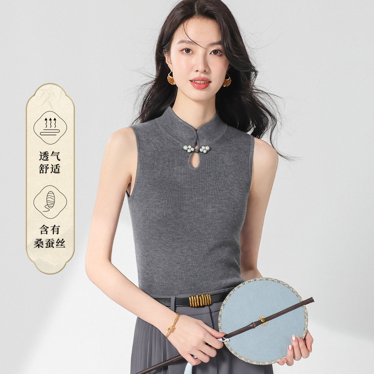 【国风】新中式轻薄透气含桑蚕丝立领无袖针织打底衫背心夏款马甲 182675