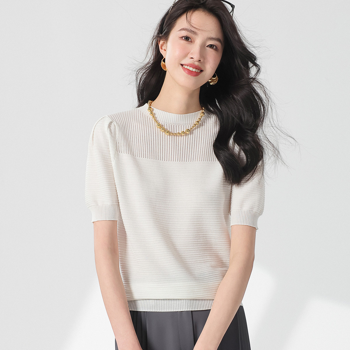 【含桑蚕丝】轻薄透气纯色泡泡袖针织衫女夏短袖T恤 222419