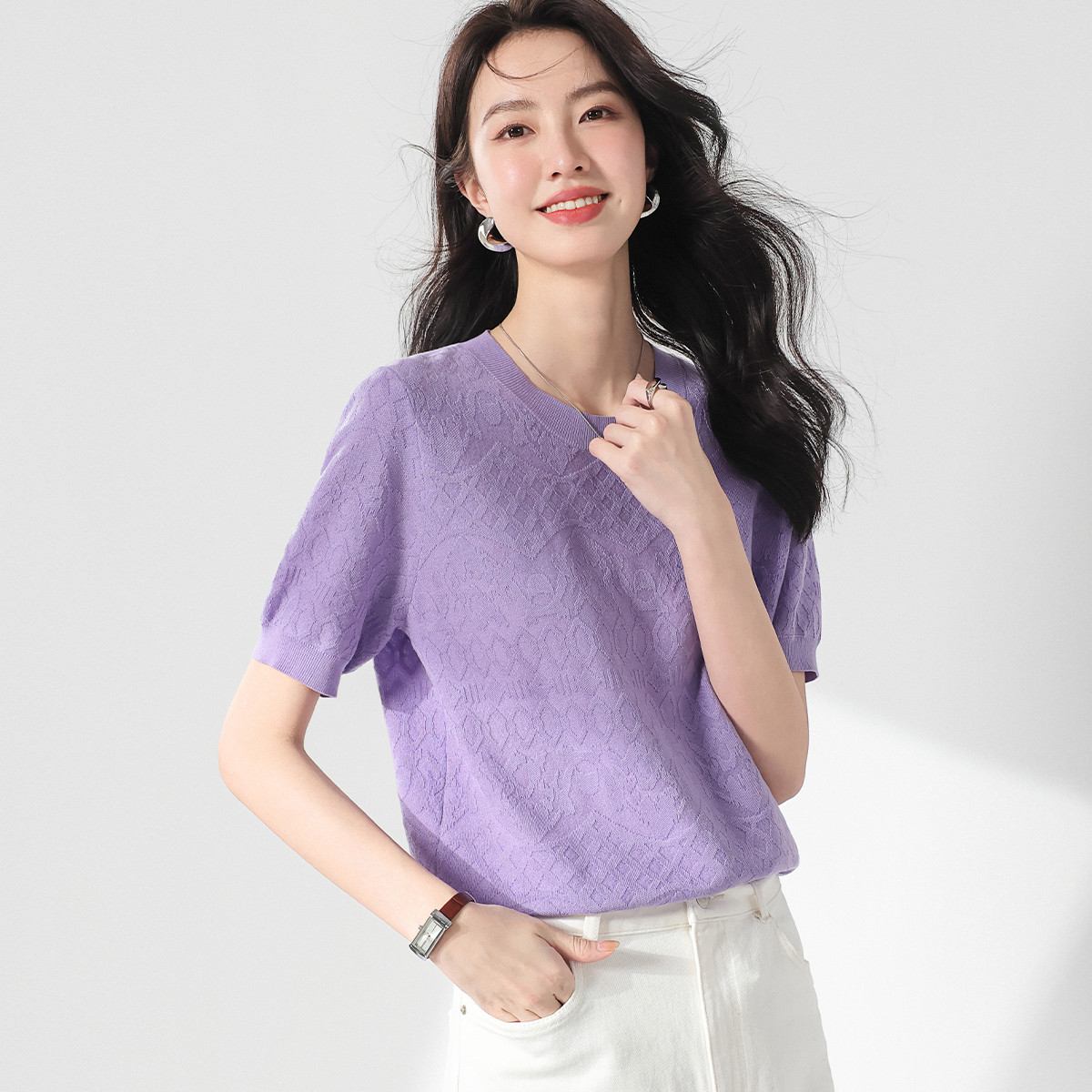 夏款轻薄纯色圆领提花含桑蚕丝针织衫女打底衫短袖女式T恤 193747