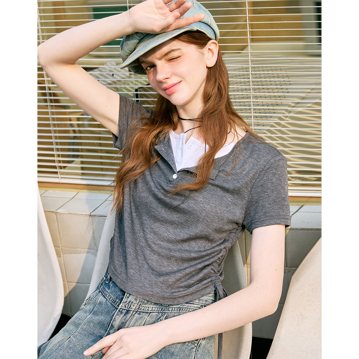 假两件撞色简约抽绳收腰显瘦女式针织衫夏季舒适面料上衣 417821