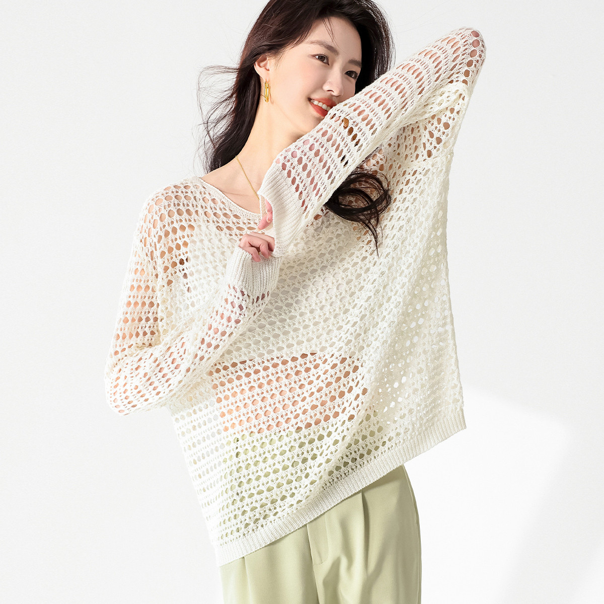 轻薄透气网眼镂空纯色圆领长袖羊毛针织衫毛衣罩衫空调衫夏款T恤 579219