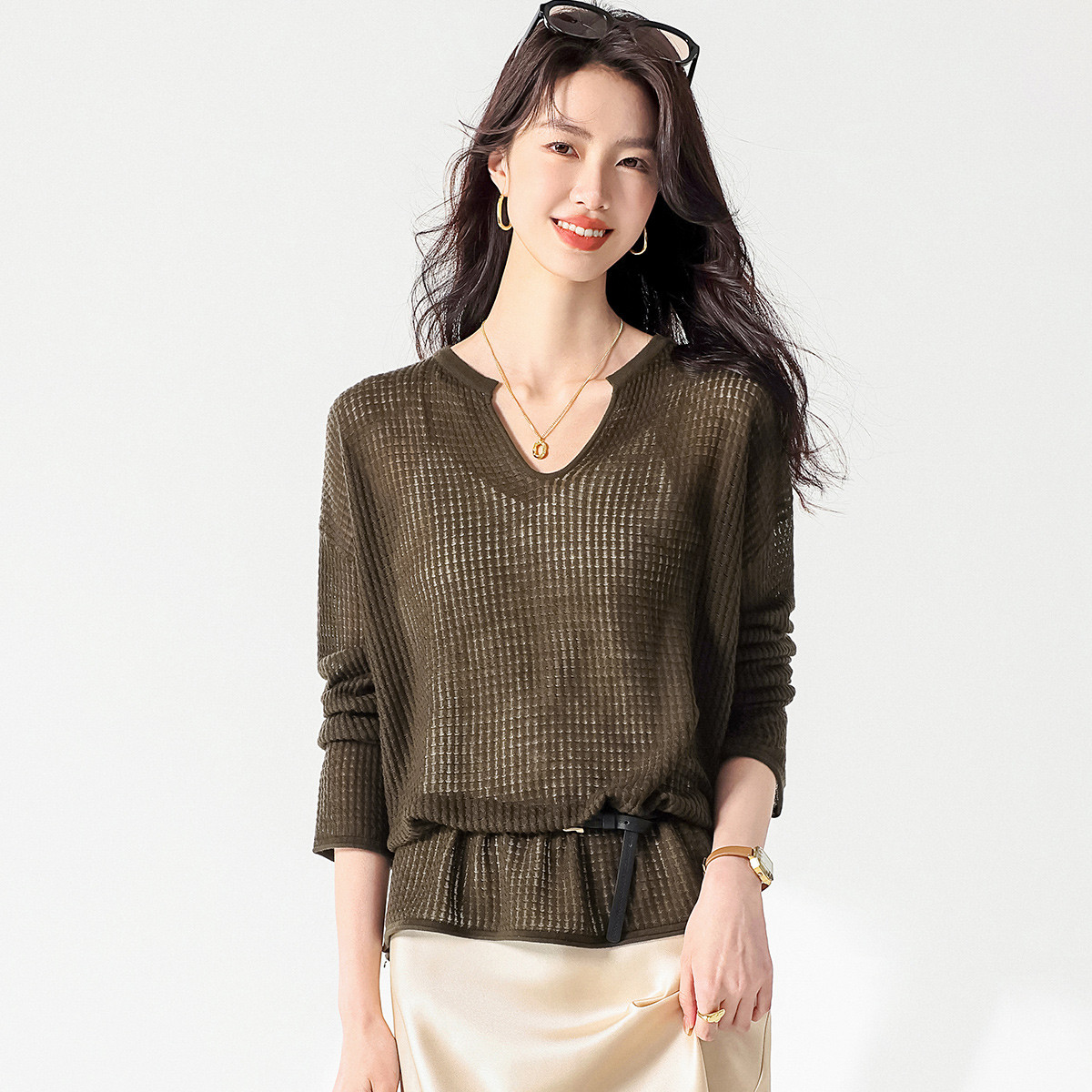【高智感老钱】秋季V领线衫舒适遮肉上衣好搭针织衫套装两件套 584129