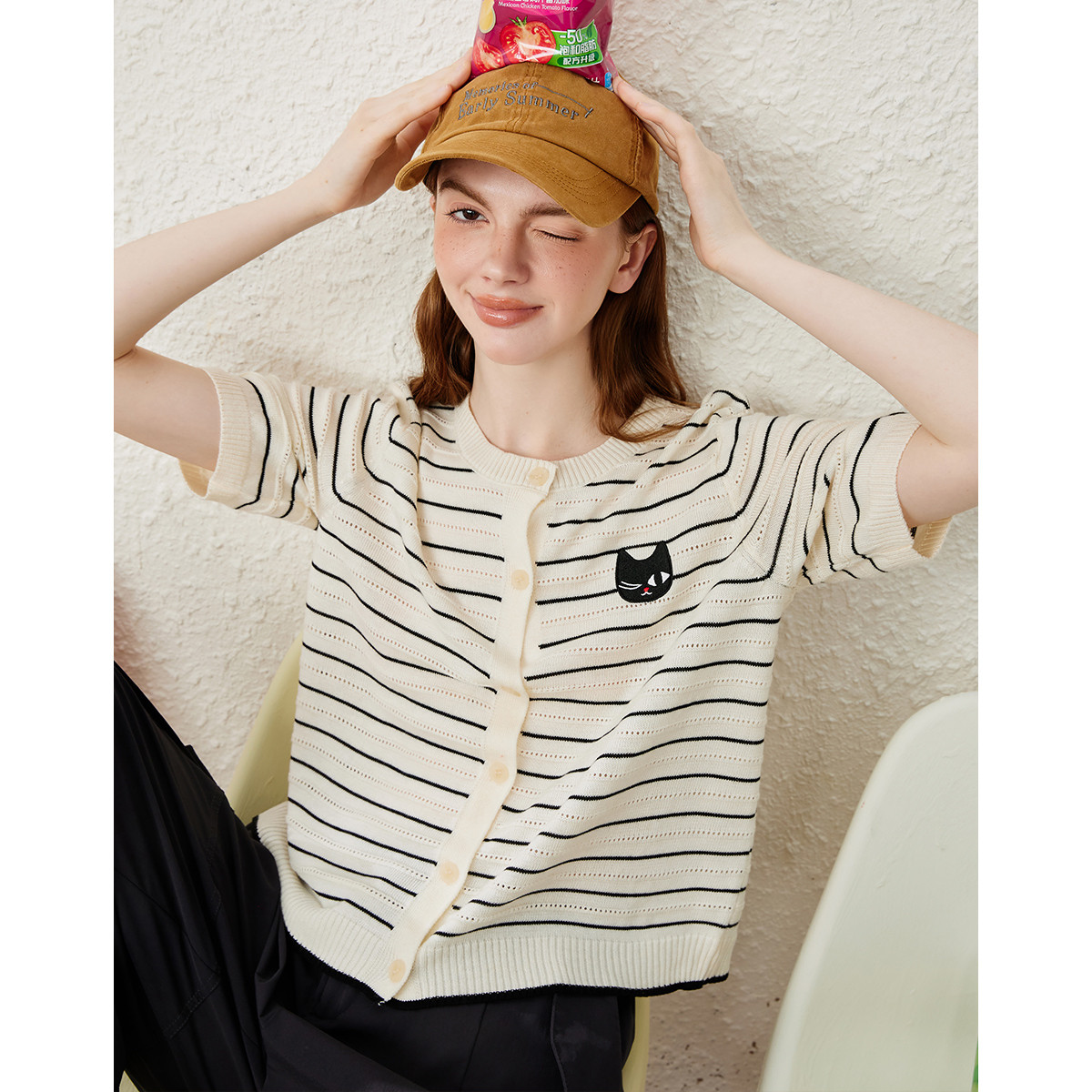 简约撞色条纹设计镂空女式针织衫夏季休闲宽松圆领短袖 469405