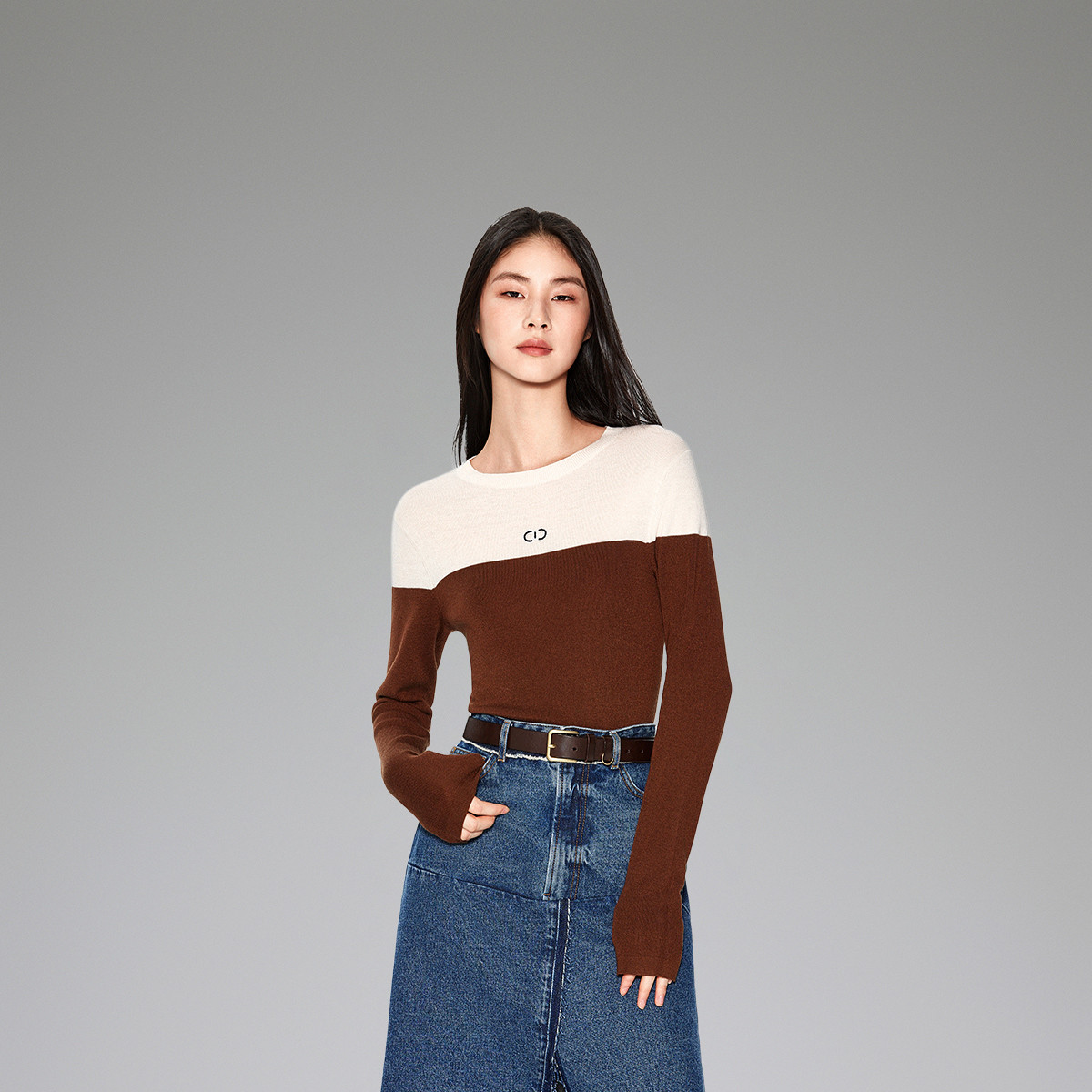 春装 撞色绣花打底上衣丝光羊毛针织毛衣女 418703