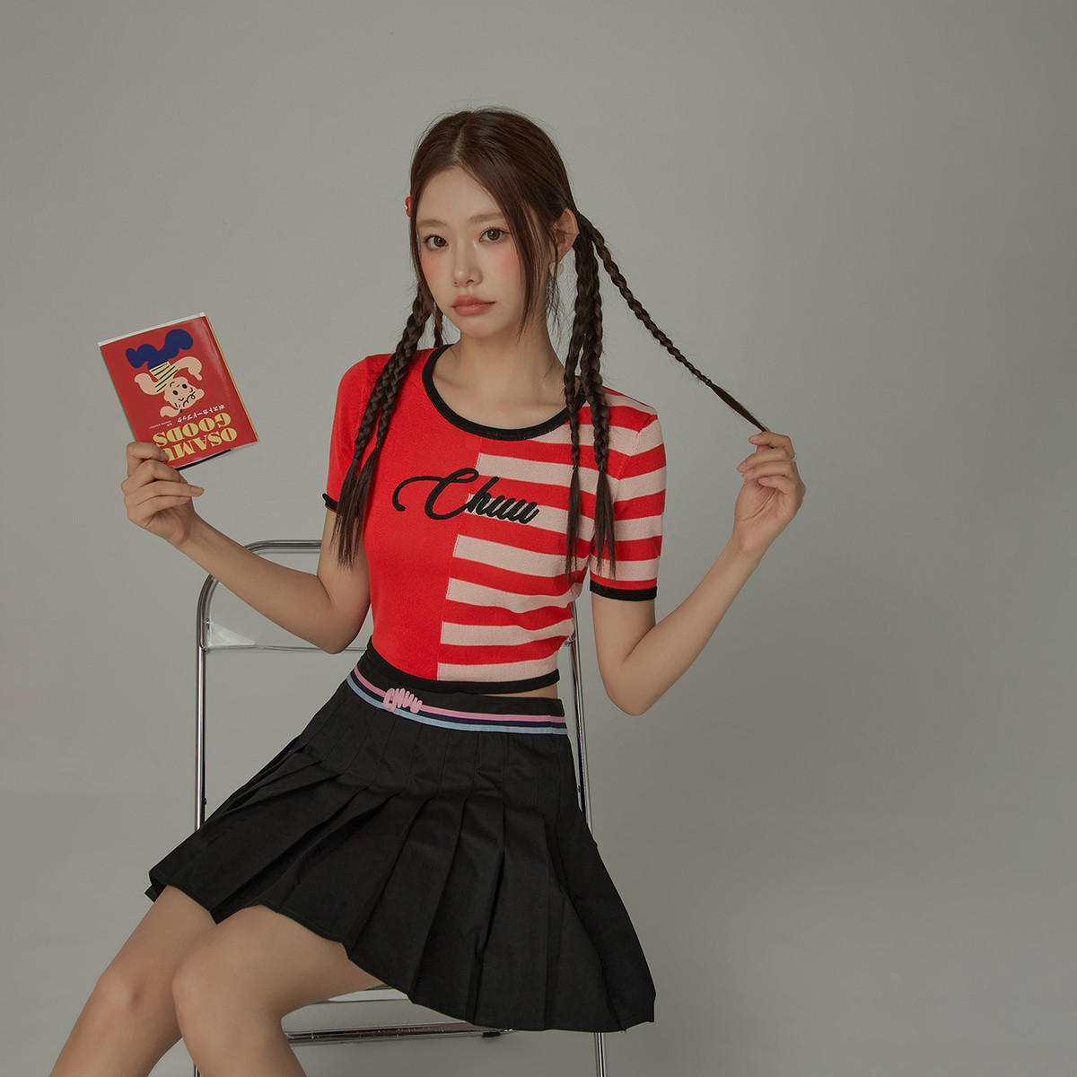 CHUU撞色条纹短袖针织衫女夏字母刺绣拼接短上衣 884115