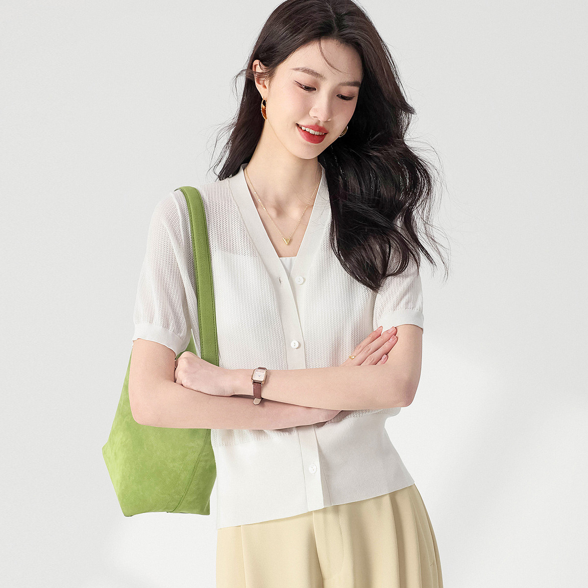 【含桑蚕丝】轻薄透气简约纯色V领针织杉女夏短袖开衫空调衫外套 132051