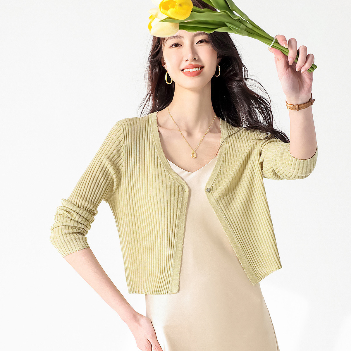 【含桑蚕丝】纯色V领抽条长袖针织打底开衫外套夏款空调衫小衫 880915