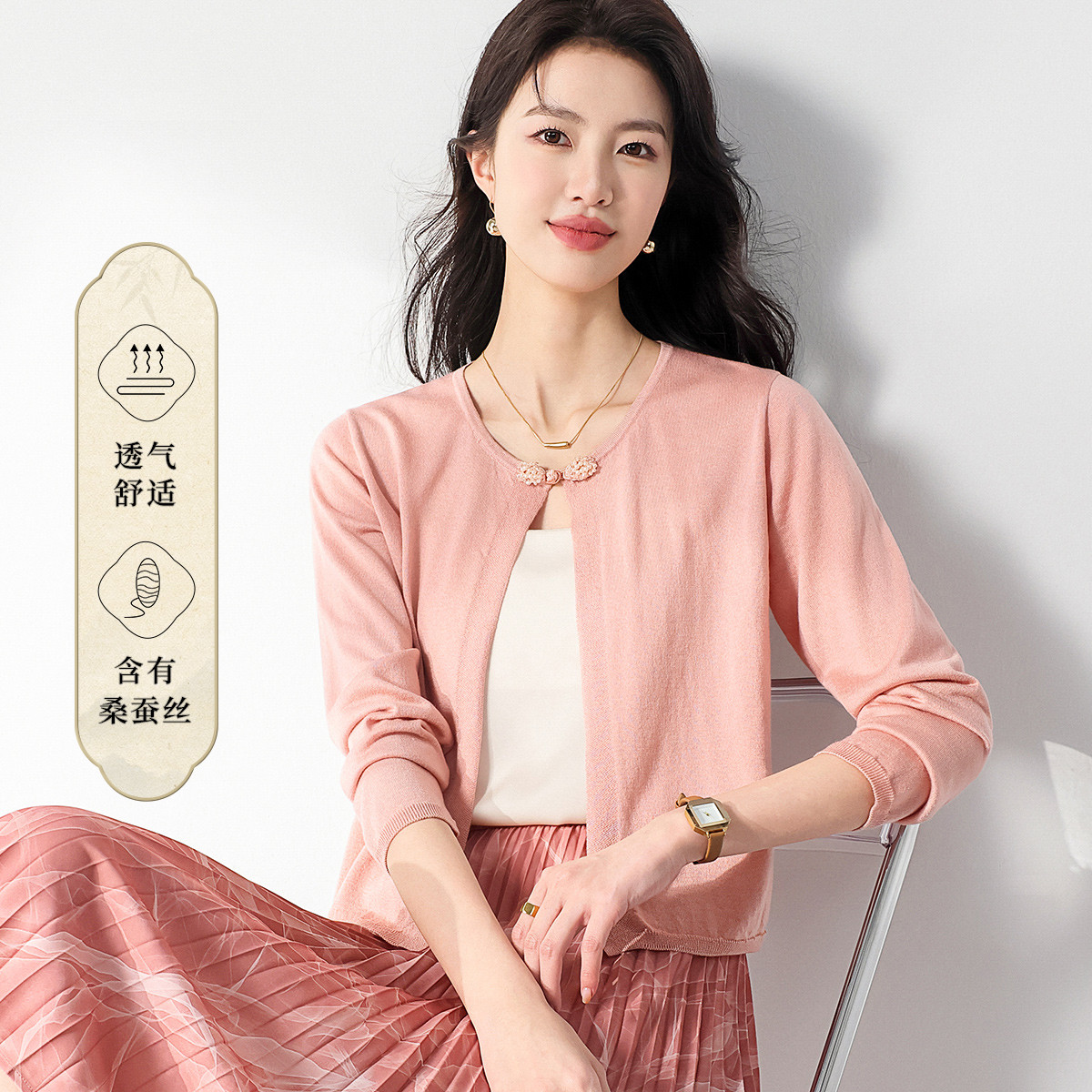 【国风】新中式纯色圆领含桑蚕丝长袖针织开衫披肩夏款外套空调衫 525715