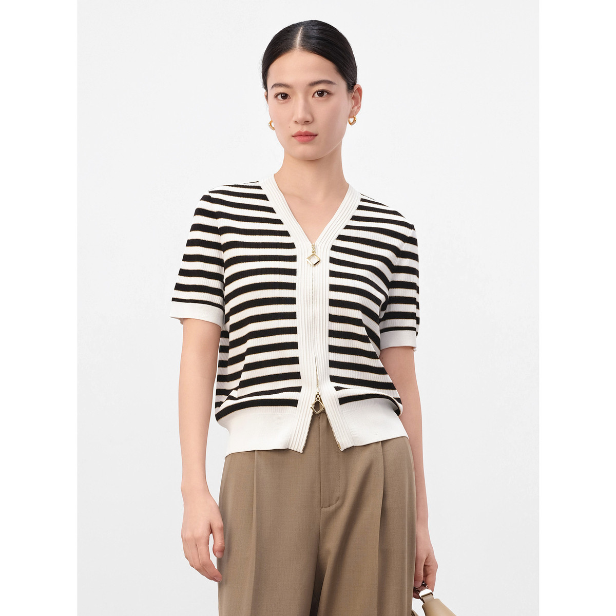 玖姿旗下安娜蔻系列简约风亮丝条纹双向拉链开衫针织衫女夏季 773452