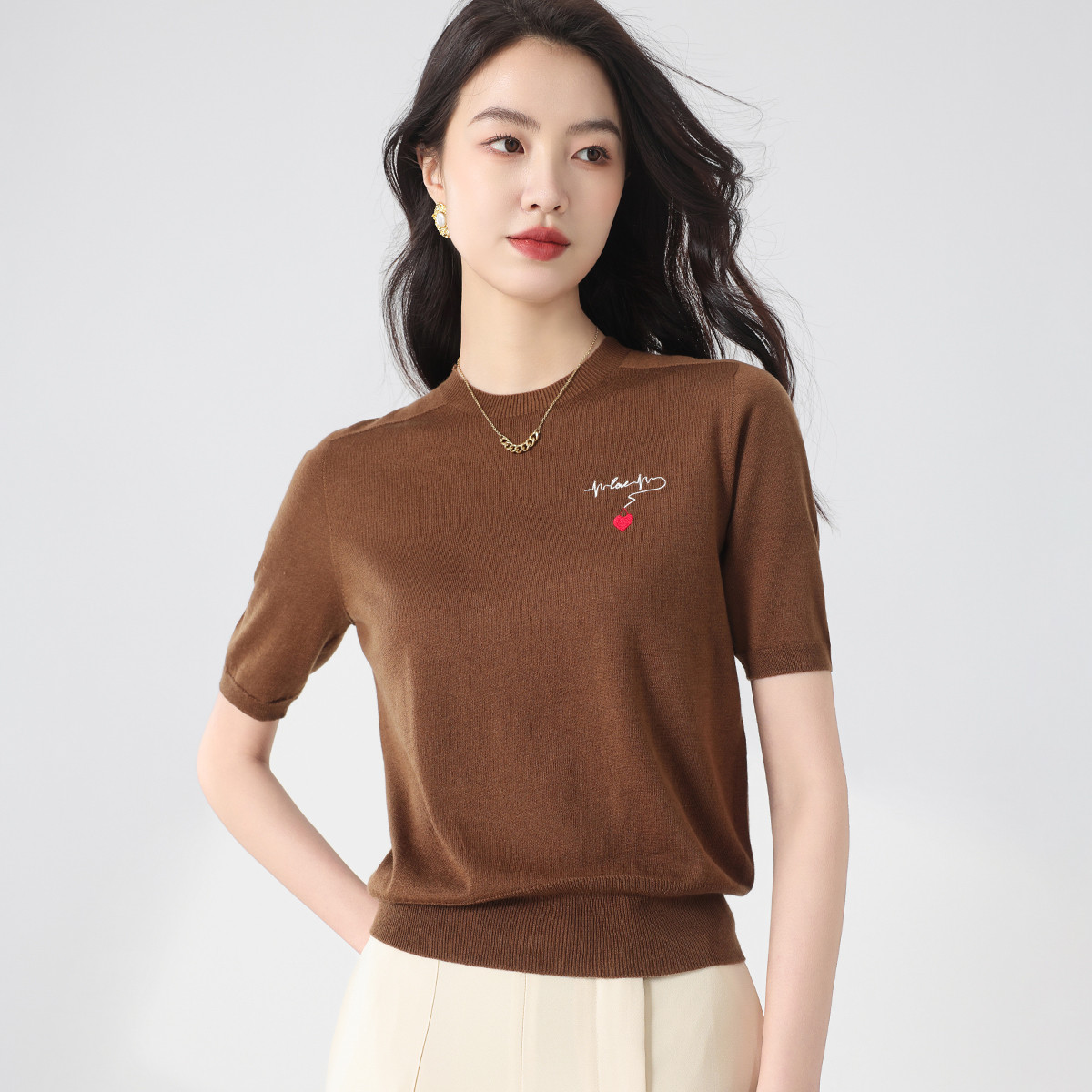 【无缝 一线成衣】轻薄透气含桑蚕丝刺绣爱心针织打底衫短袖T恤 755603