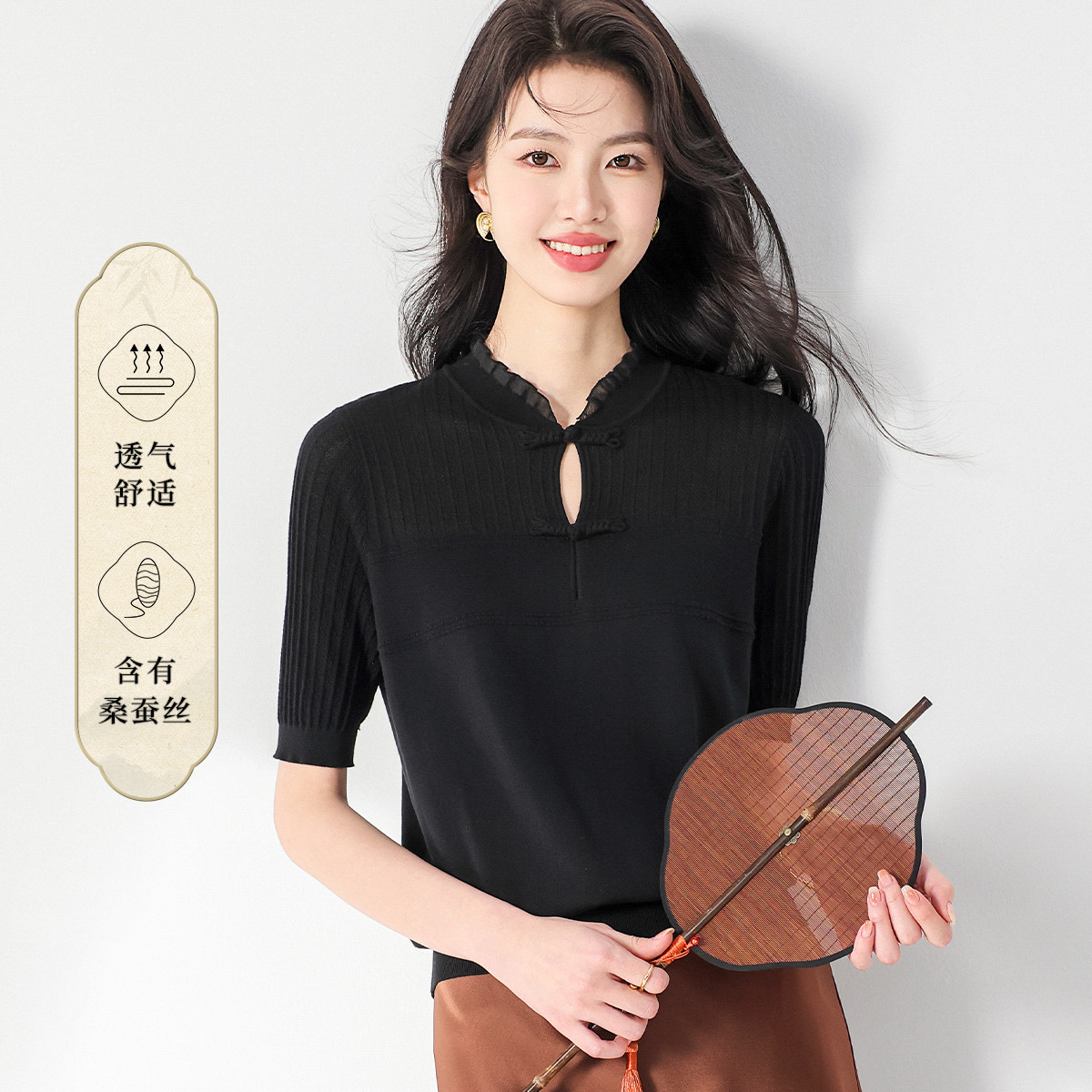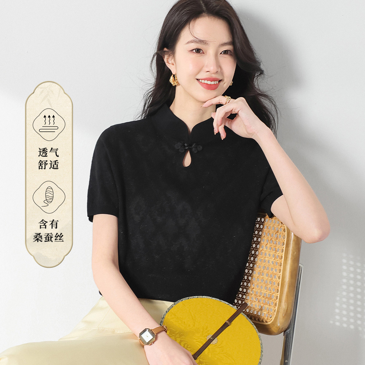 国风~轻薄透气含桑蚕丝立领打底衫短袖T恤针织衫女夏妈妈装上衣 268691