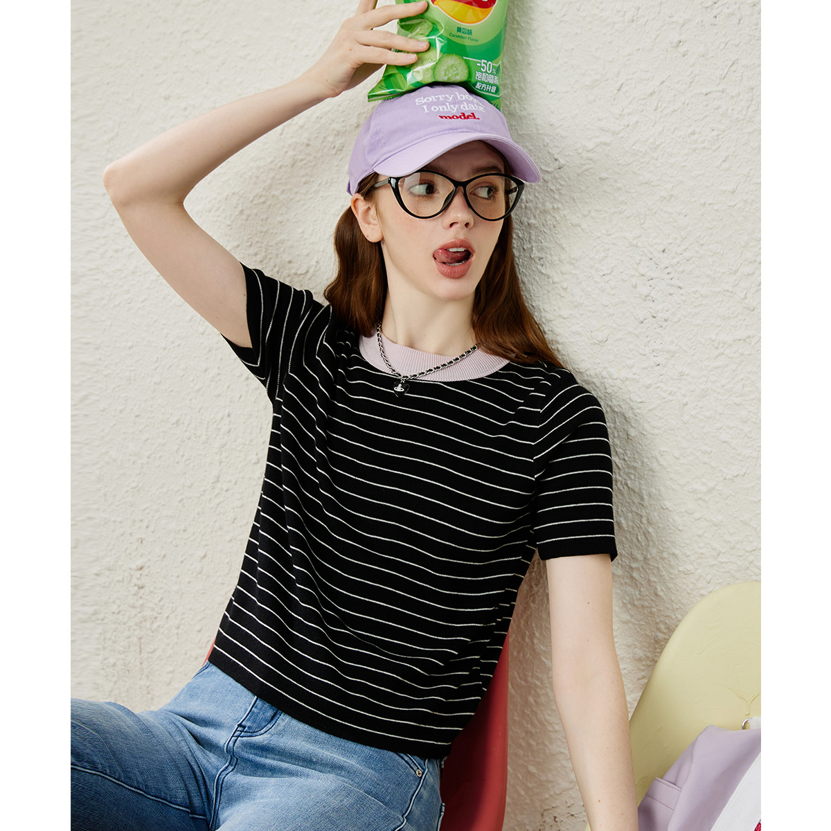 垂感撞色条纹领口个性装饰女式针织衫夏季收腰短袖上衣 263133