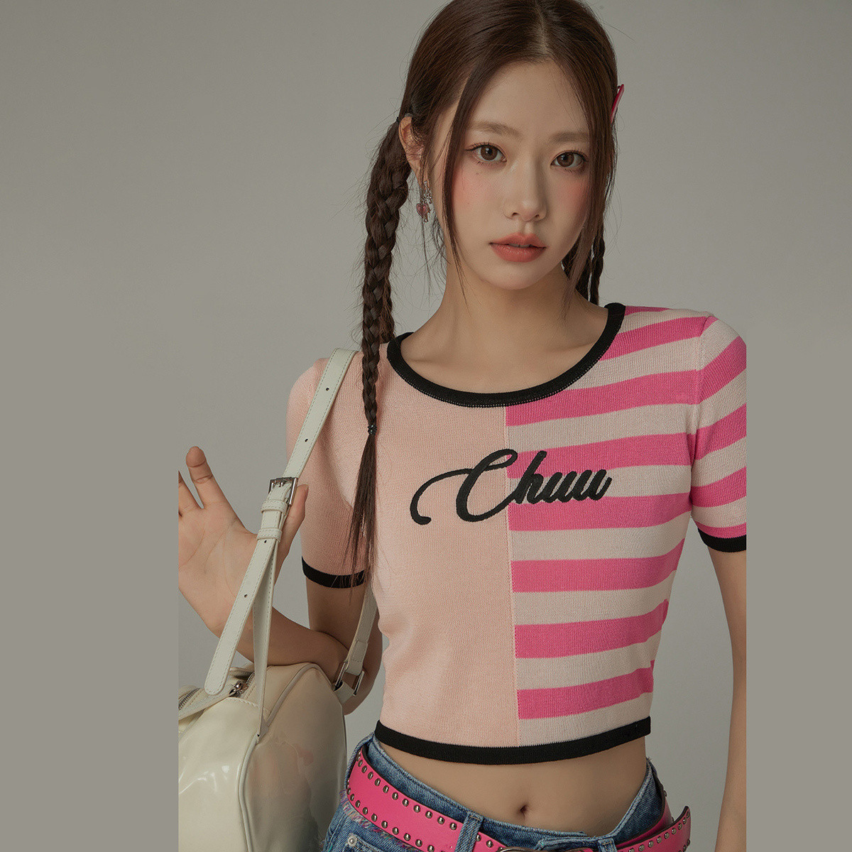 CHUU撞色条纹短袖针织衫女夏字母刺绣拼接短上衣 834963