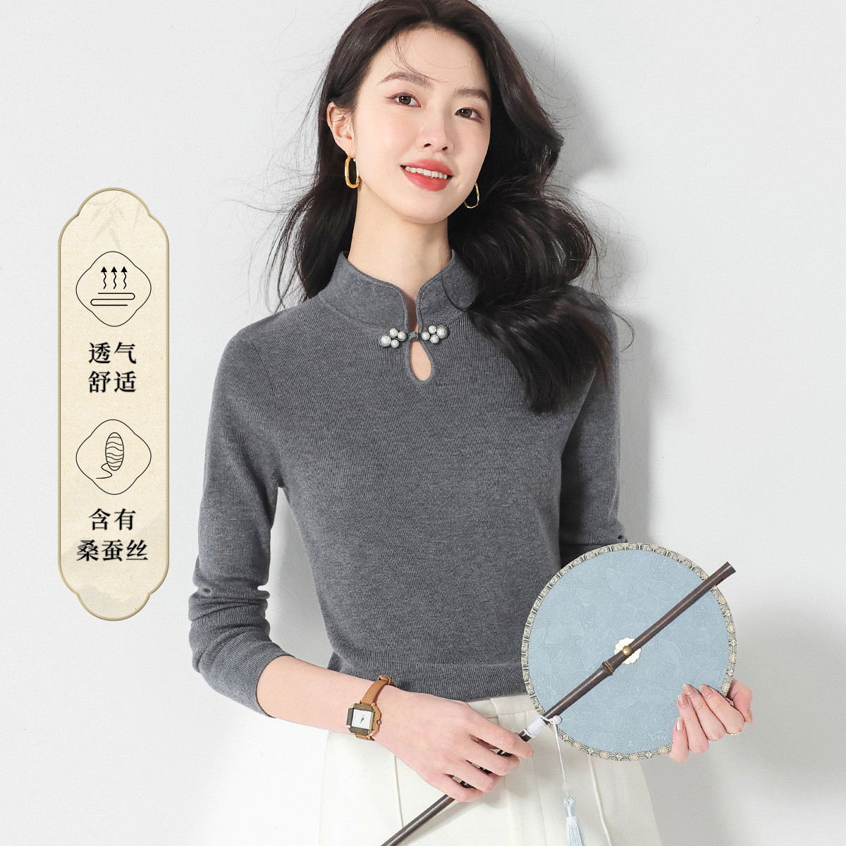 国风新中式轻薄透气含桑蚕丝立领针织打底衫夏款长袖T恤妈妈装 149907