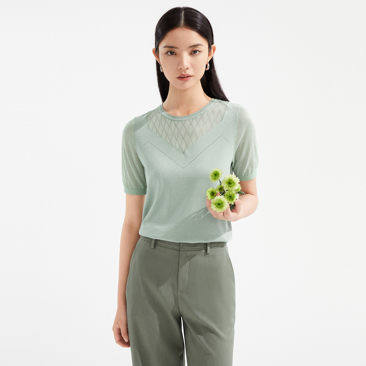 玖姿旗下安娜蔻系列BlingBling水晶葱纱圆领短袖针织衫女夏季 102284