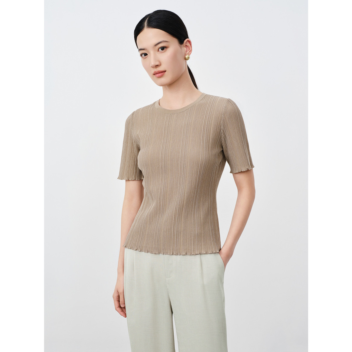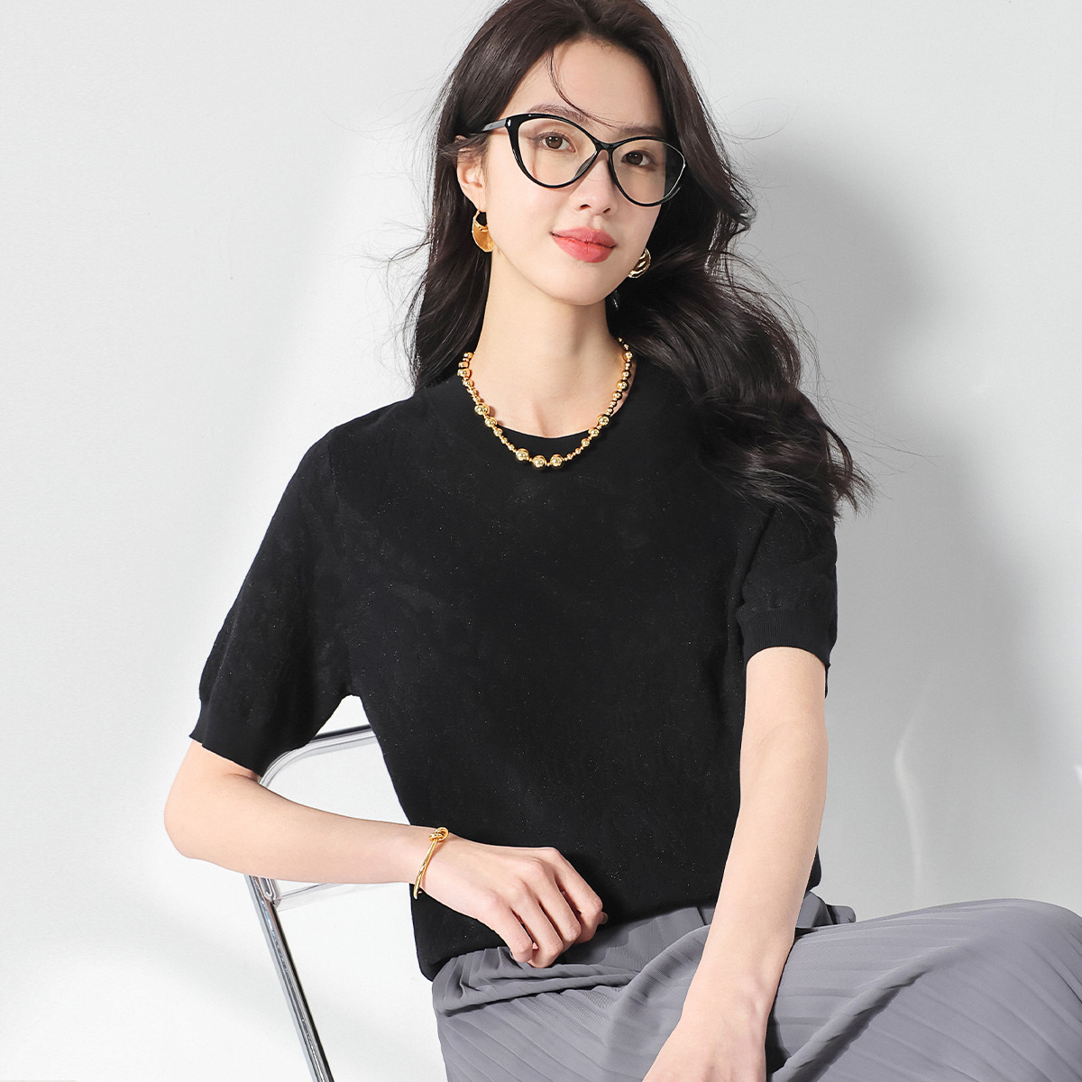 夏款轻薄纯色圆领提花含桑蚕丝针织衫女打底衫短袖女式T恤 042195