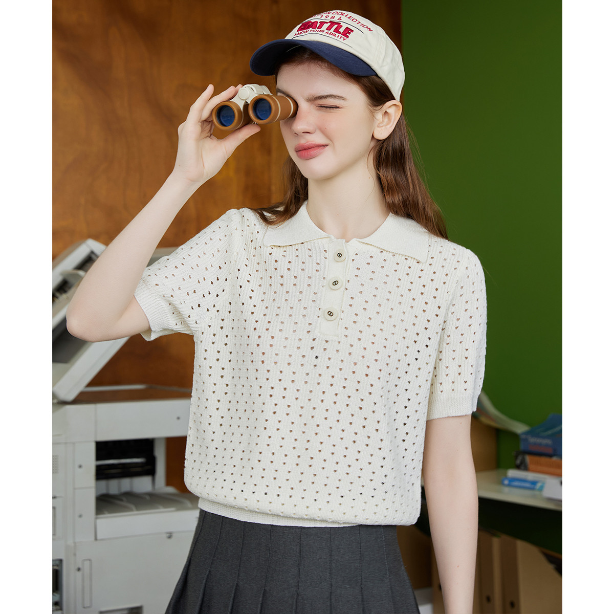 简约撞色Polo领镂空设计女式针织衫夏季收腰短袖上衣 343453