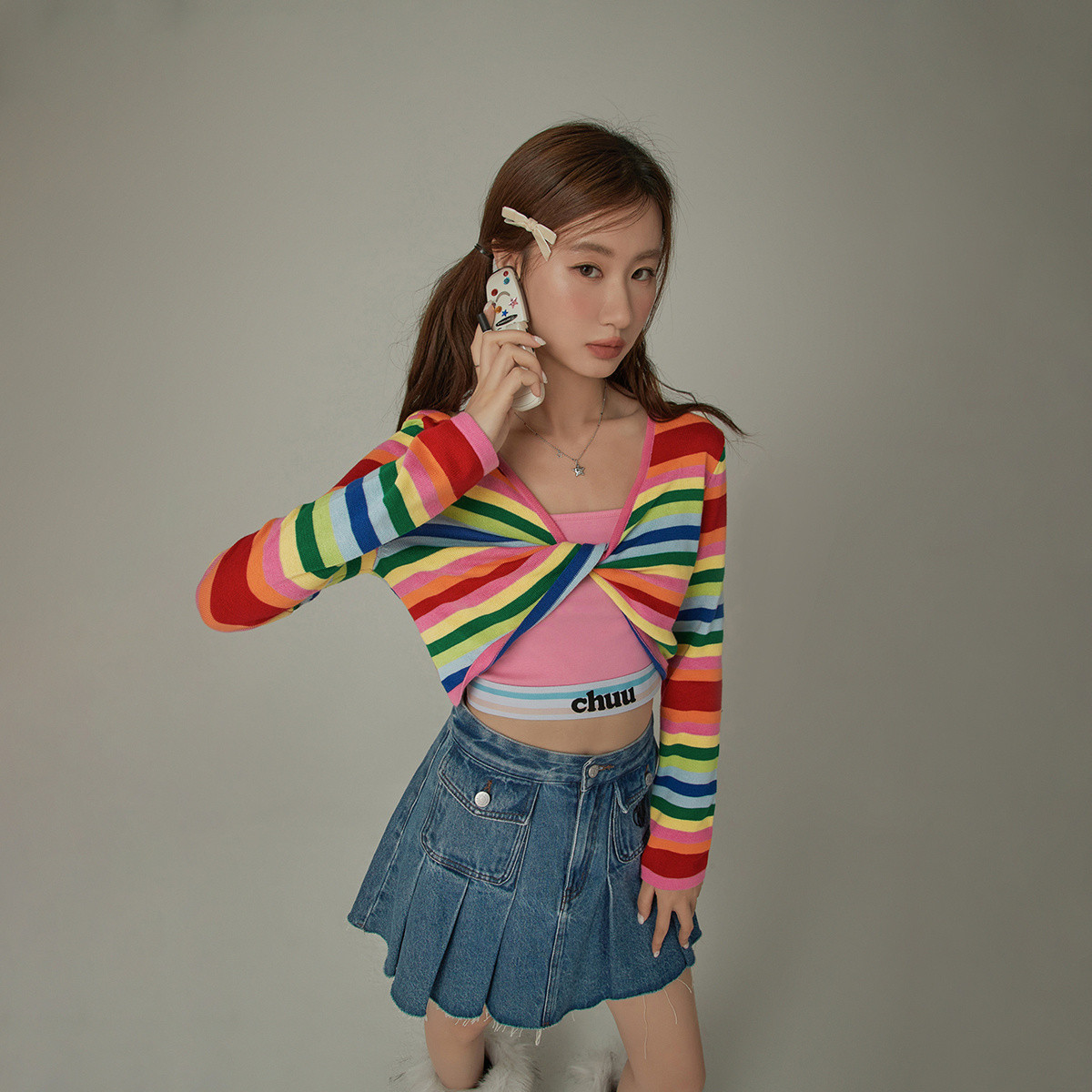 CHUU撞色条纹针织衫女春秋多巴胺穿搭扭结套头上衣 171987