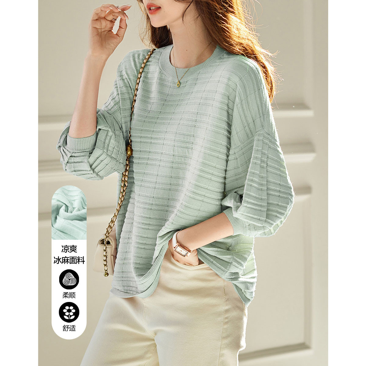【欧根纱条纹肌理提花】春秋圆领七分袖线衫冰麻针织衫女上衣 067393