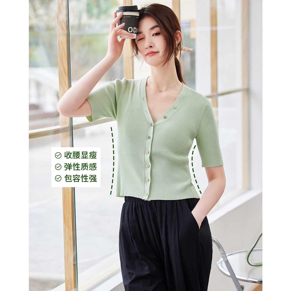 【含天丝桑蚕丝】春夏专柜修身v领拼色针织开衫气质百搭时尚 618897