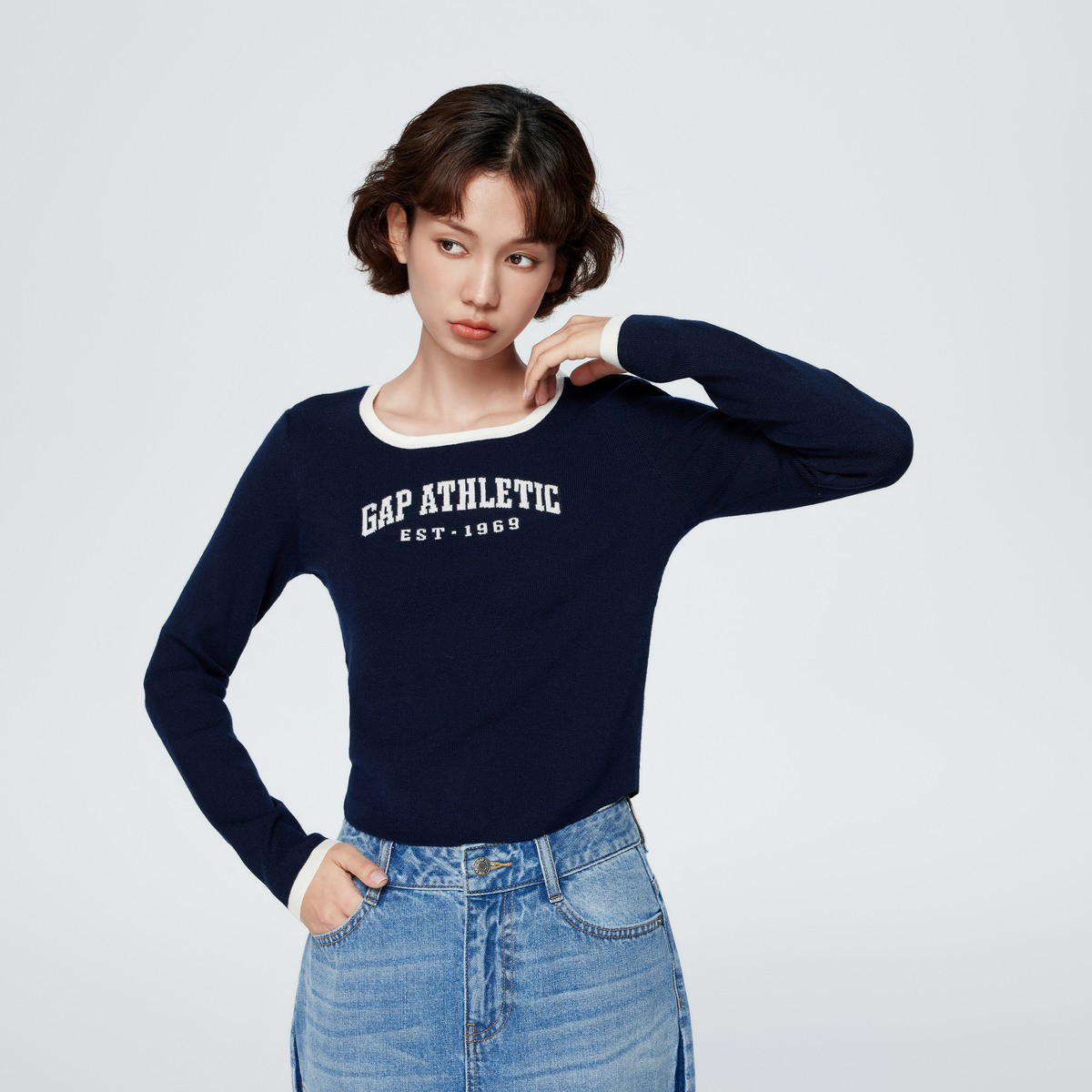 Gap女装春夏款LOGO提花休闲复古紧身圆领针织衫891639上衣 067610