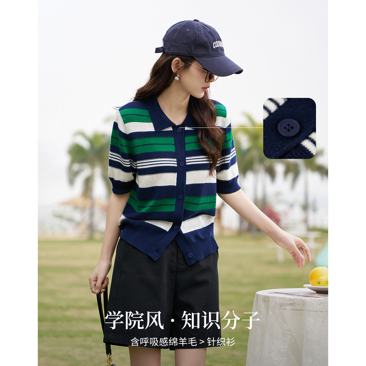 【撞色条纹针织T恤】早春学院风减龄时尚透气翻领显瘦女式针织衫 671617