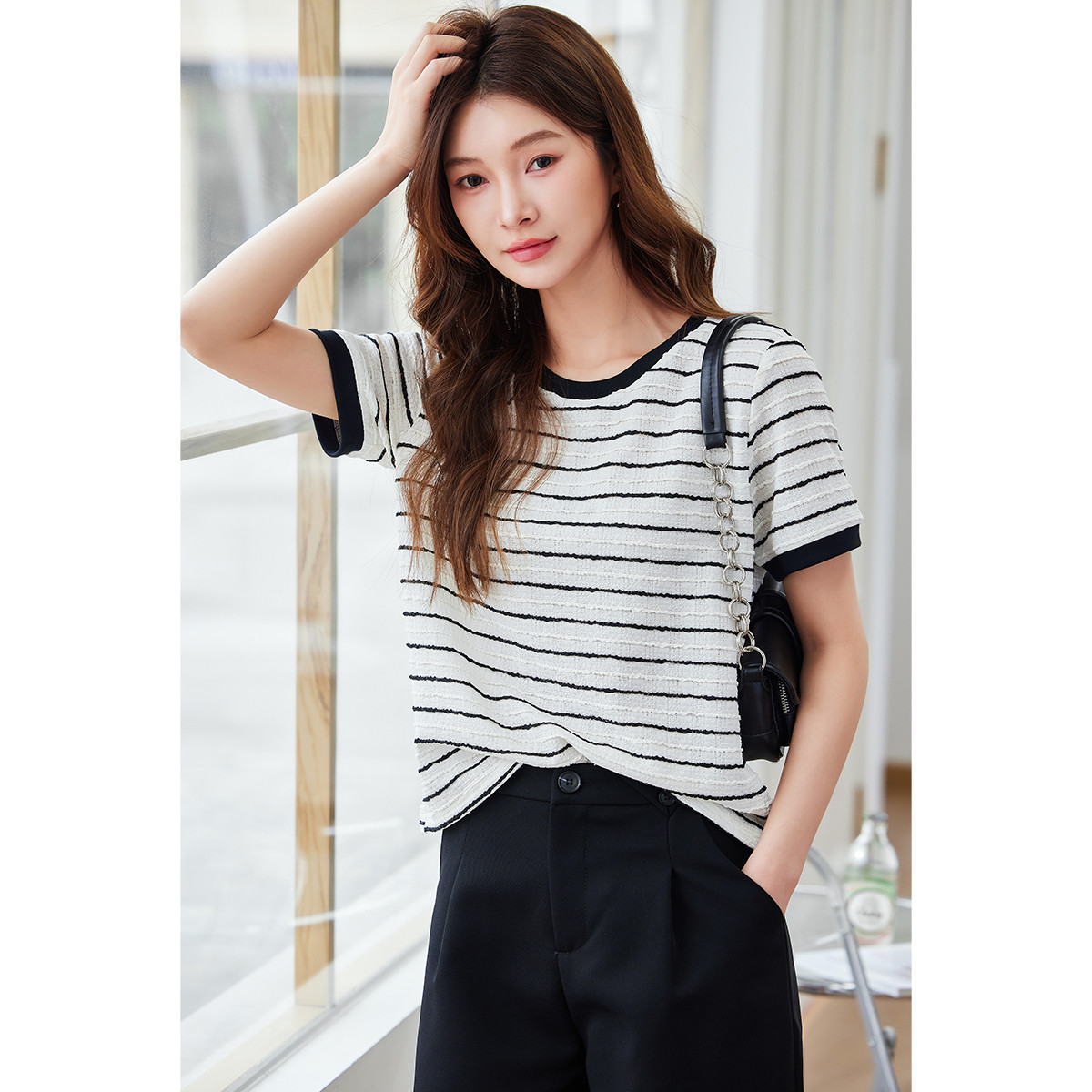 米子旗夏季款圆领条纹T恤女肌理感宽松短袖上衣 676058