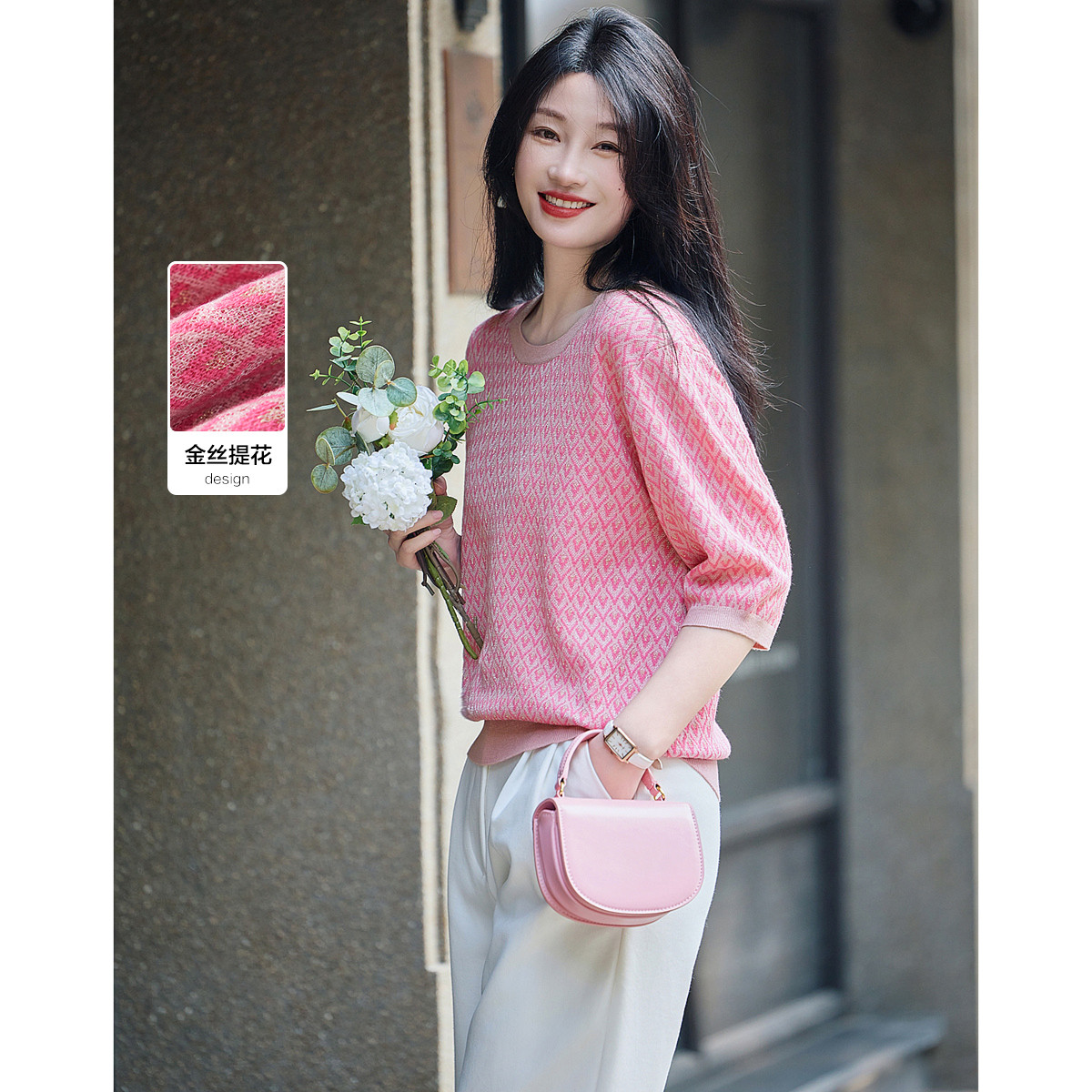 【多巴胺穿搭】夏新少女心圆领菱形花纹线衫金丝提花针织衫女上衣 453057