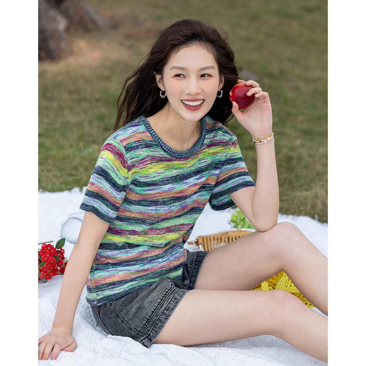 渐变色短袖T恤女2025夏季新款小众个性简约休闲短款针织T恤 431369