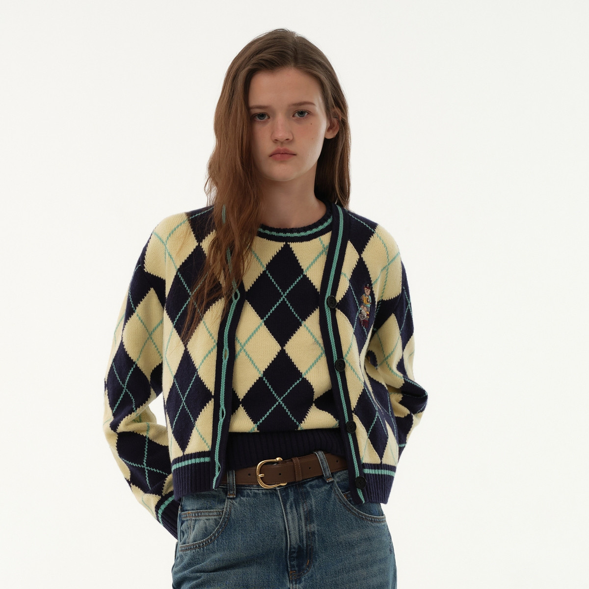 针织开衫小熊菱形格毛衣慵懒风外套绵羊毛混纺针织开衫 982145
