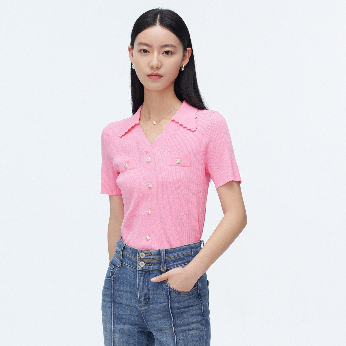 装饰扣优雅针织短袖T恤女夏季淑女通勤上衣修身弹力气质针织衫女 346627