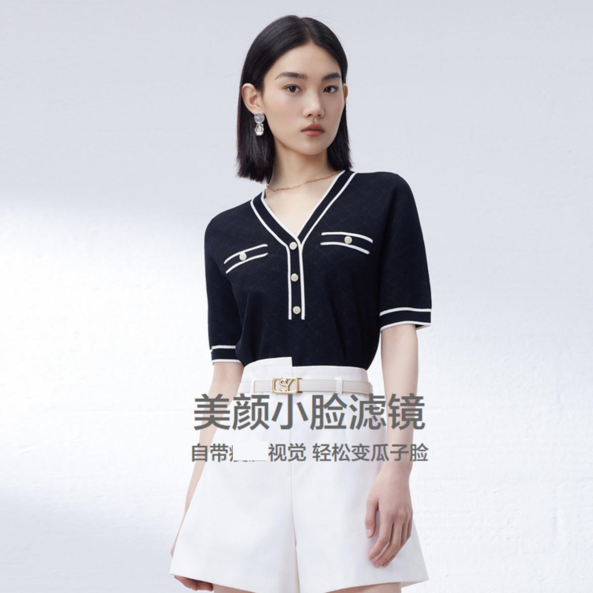 通勤气质V领针织衫女夏款显瘦时尚撞色透气百搭休闲短袖T恤女 031875